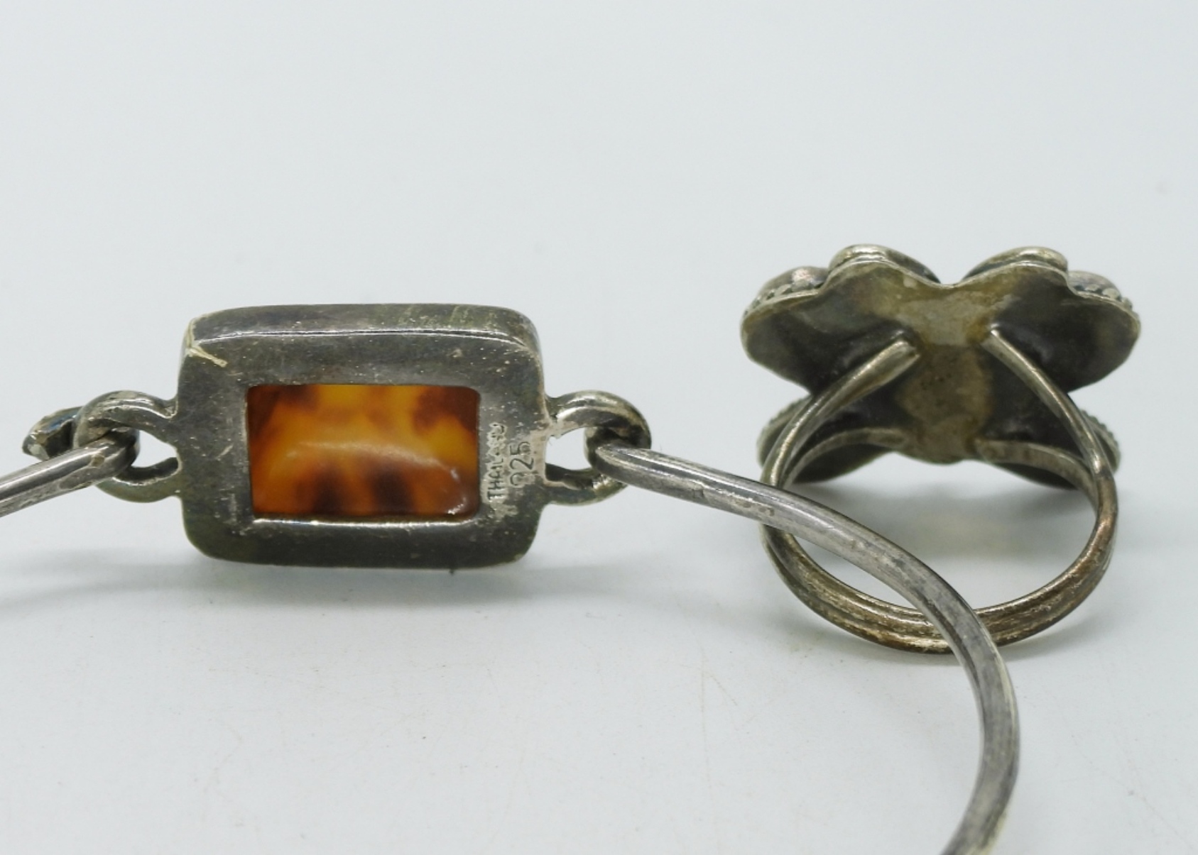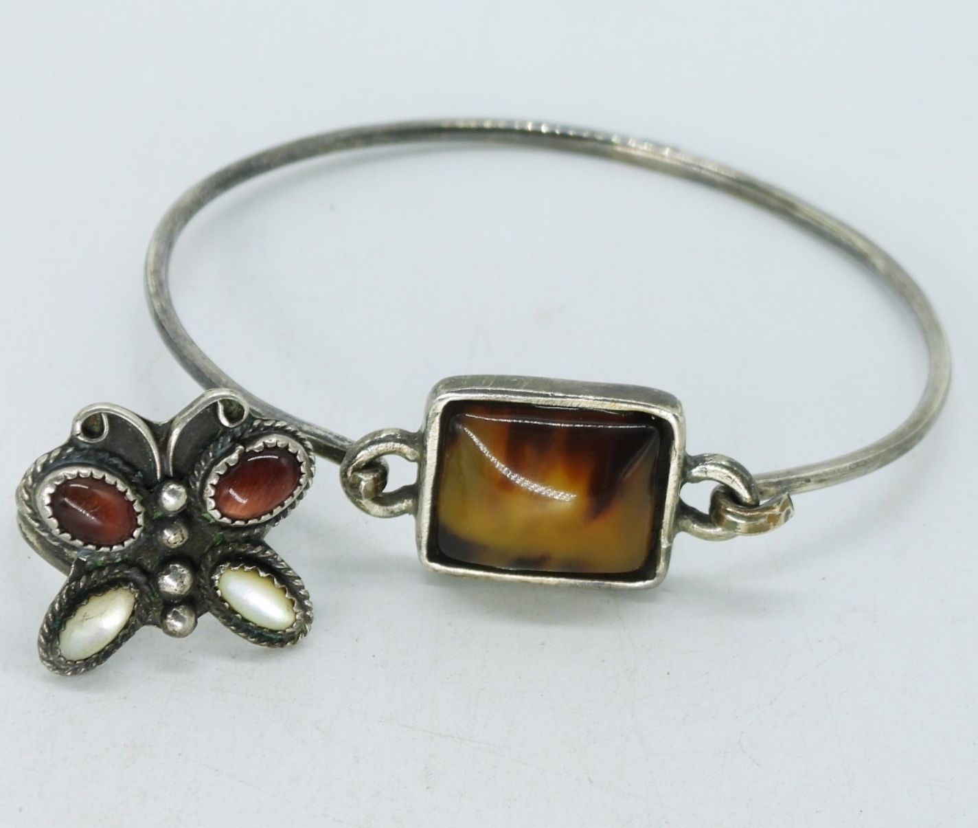 Beautiful sterling bangle bracelet, tortoise shell colored stone. Butterfly ring with mother of pearl and unknown gemstones, size 5. (9.4 dwt)
