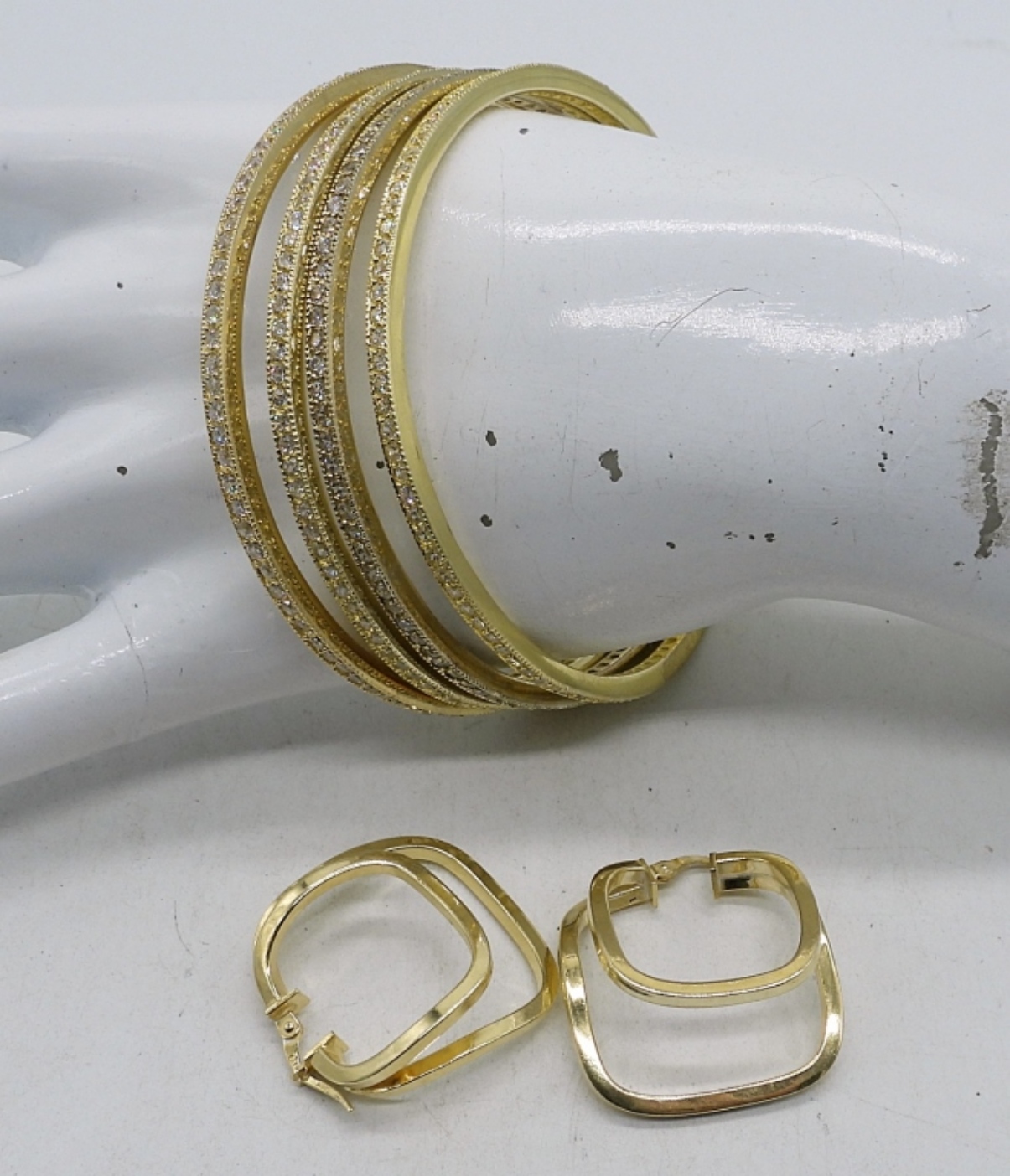 Four sterling, gold tone bangle bracelets. One pair of pierced gold tone, sterling earrings. (41.3 DWT)