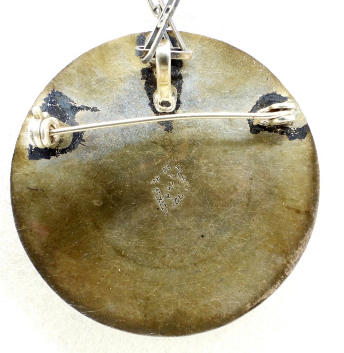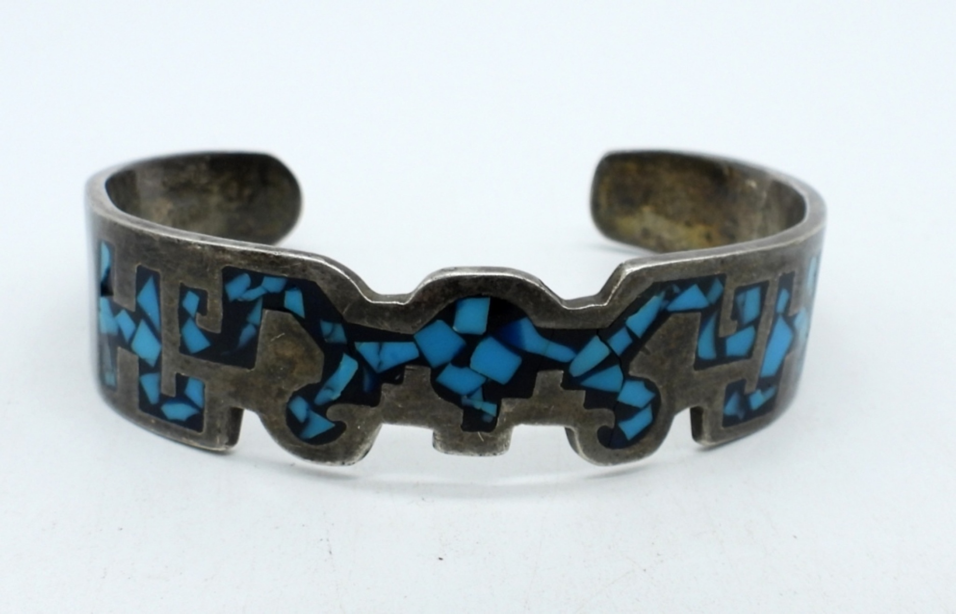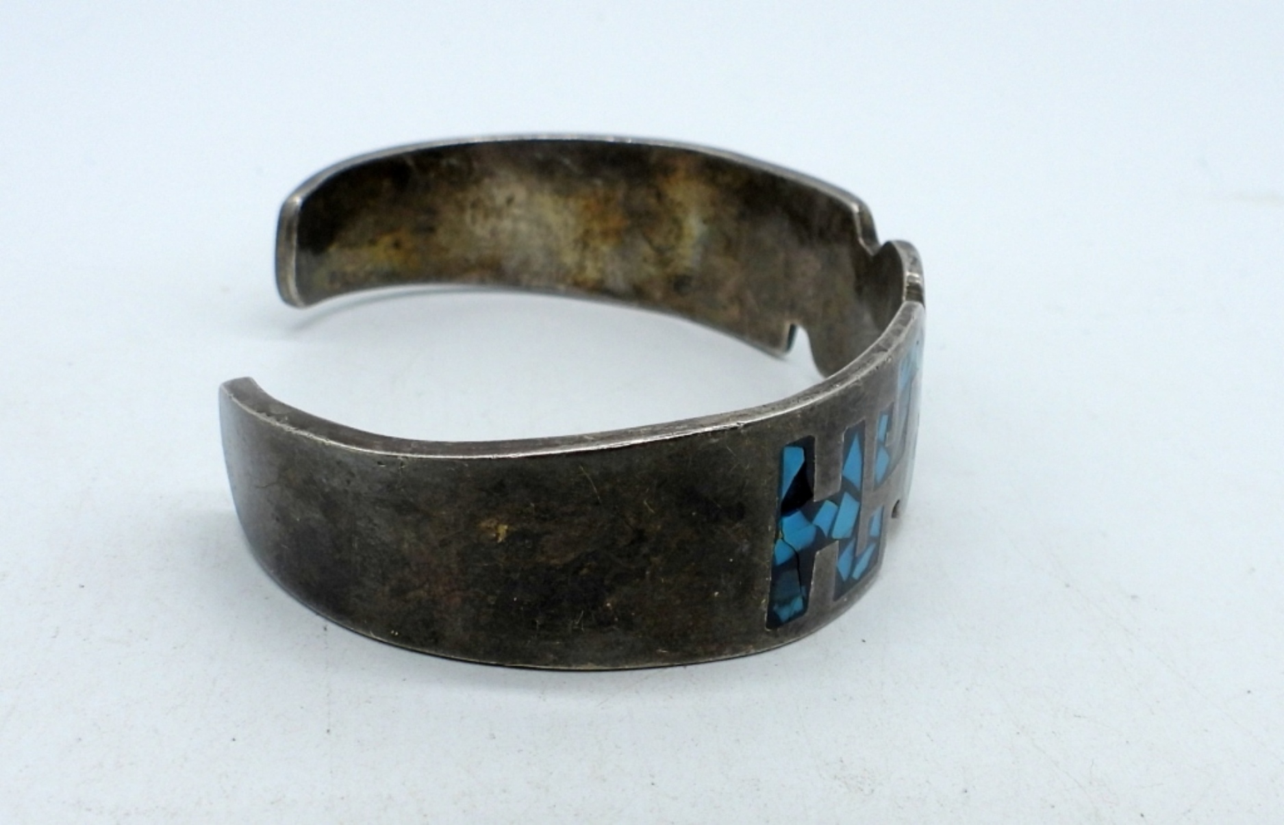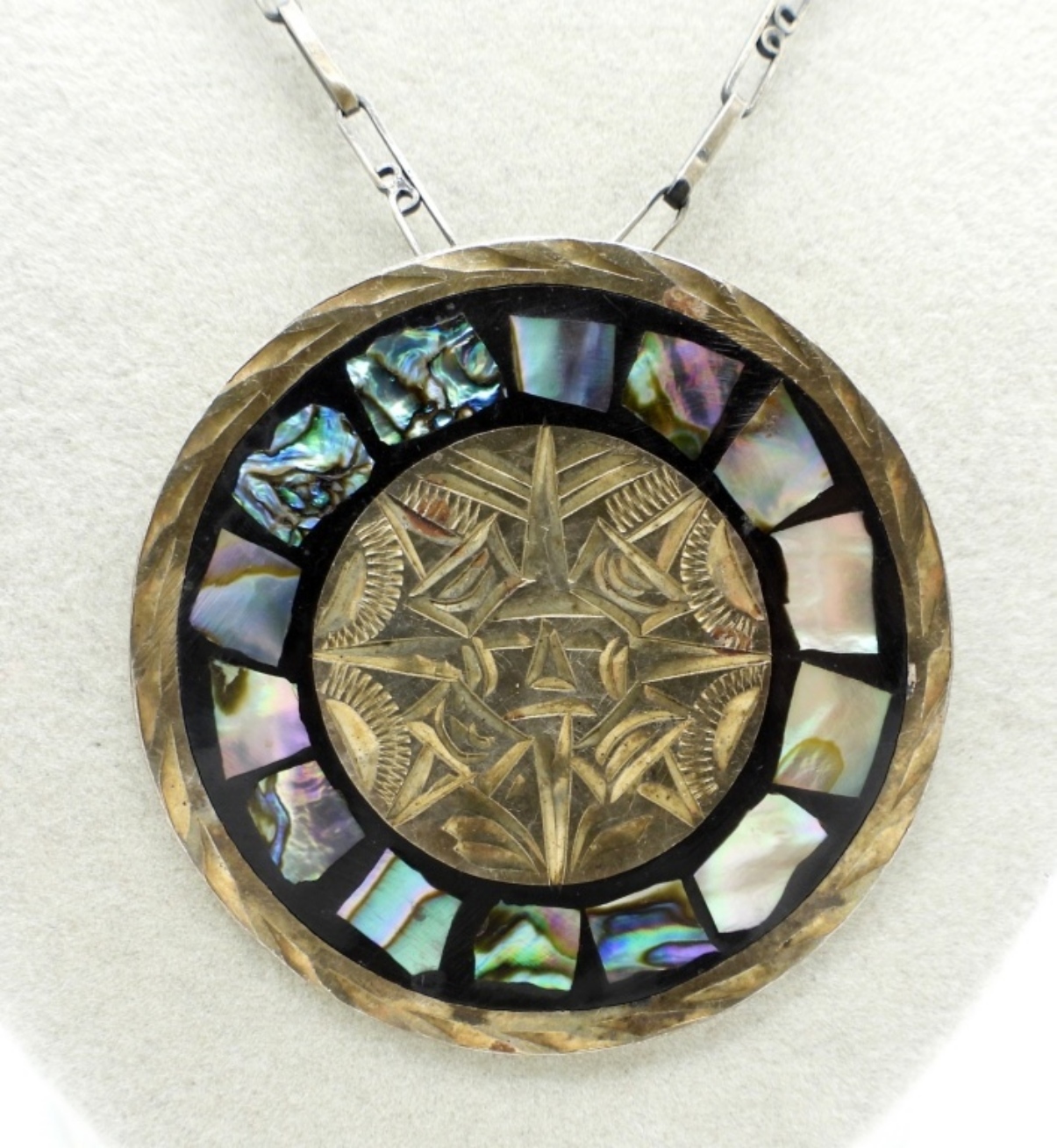 Mexico Plata gold tone sterling necklace with abalone shell inlay, 24″ chain. Sterling cuff bracelet with inlaid turquoise. (36.9 dwt)
