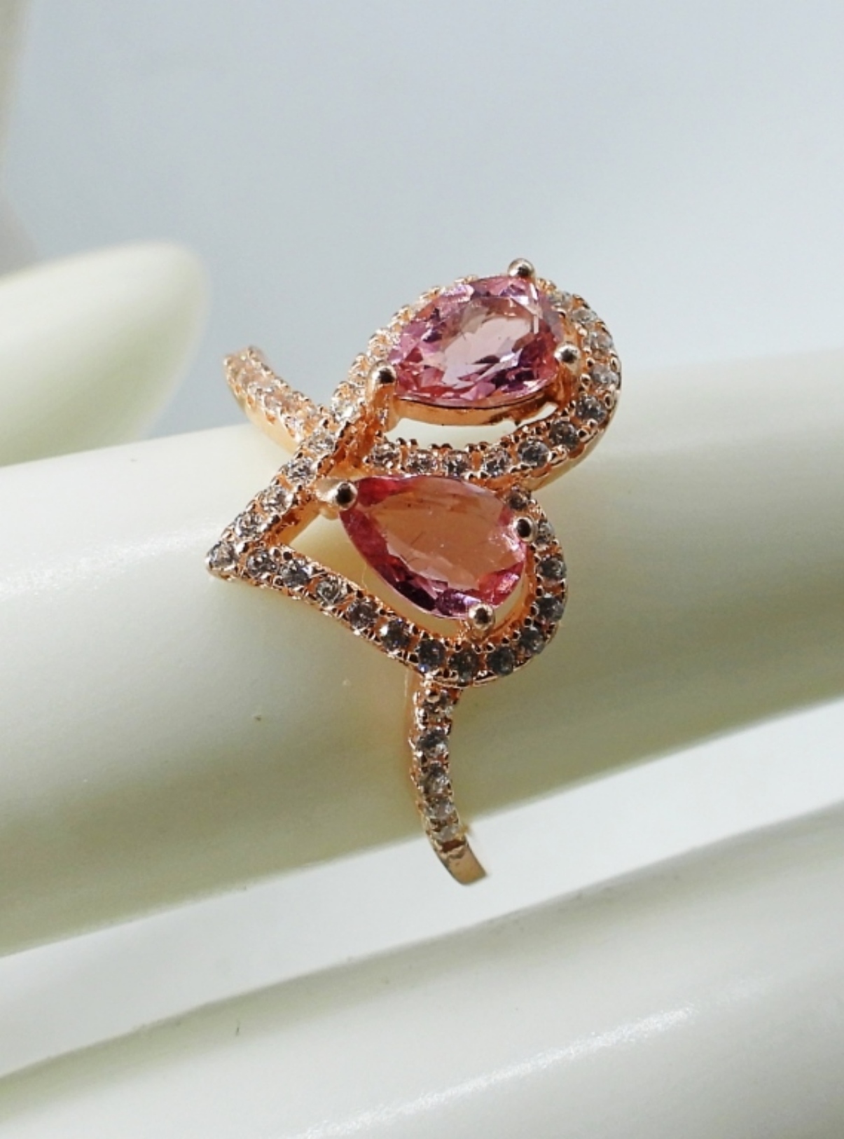 Gold tone sterling, pink cz set. Necklace 18″, Bracelet 7″. Ring size 6 (32 DWT)