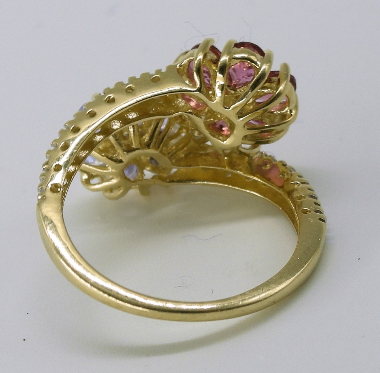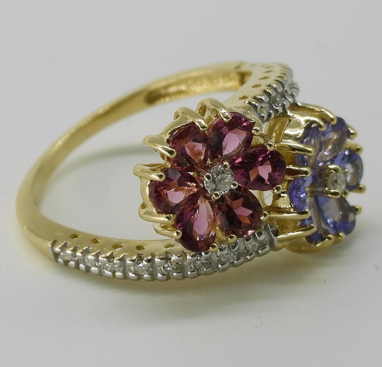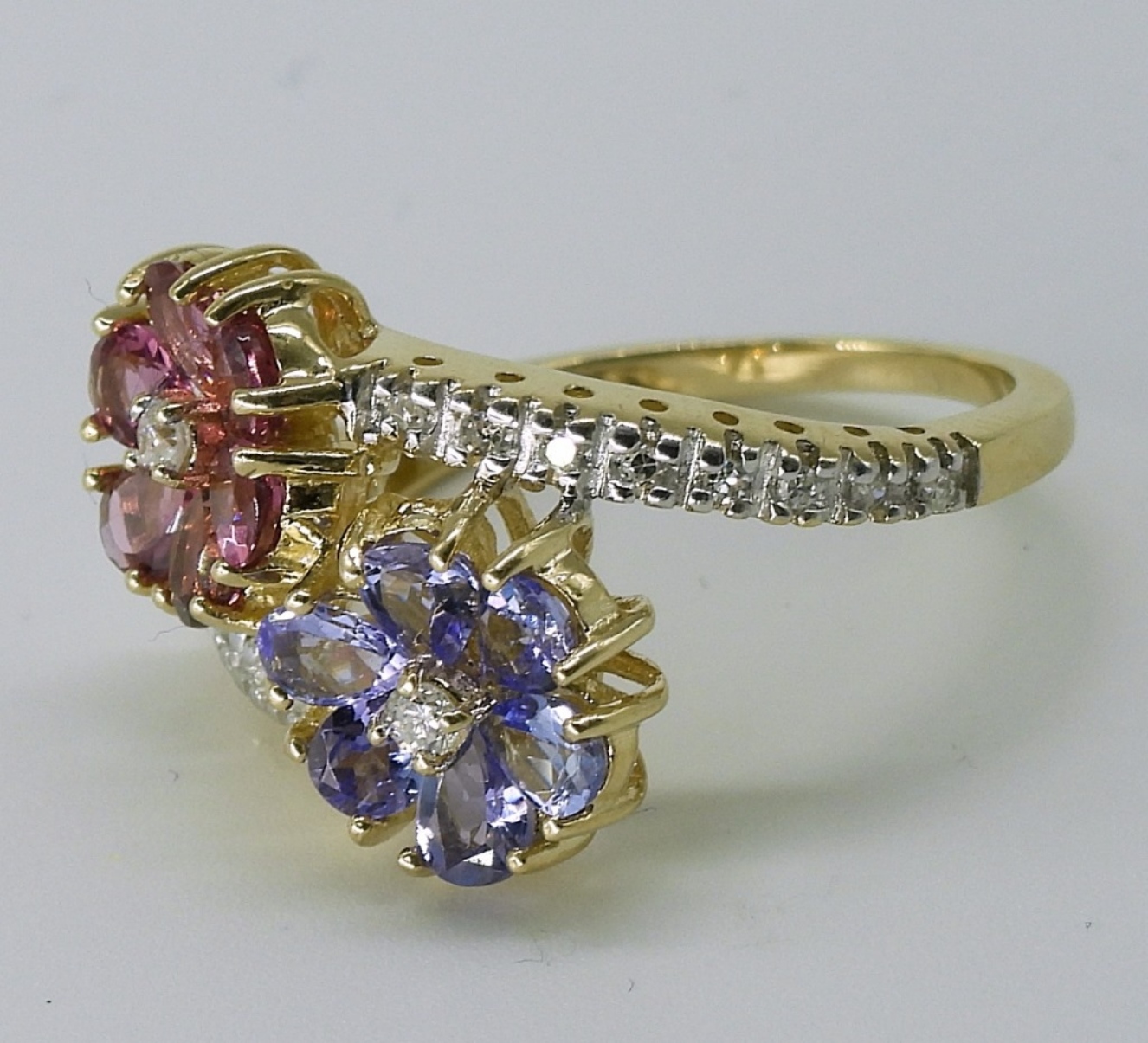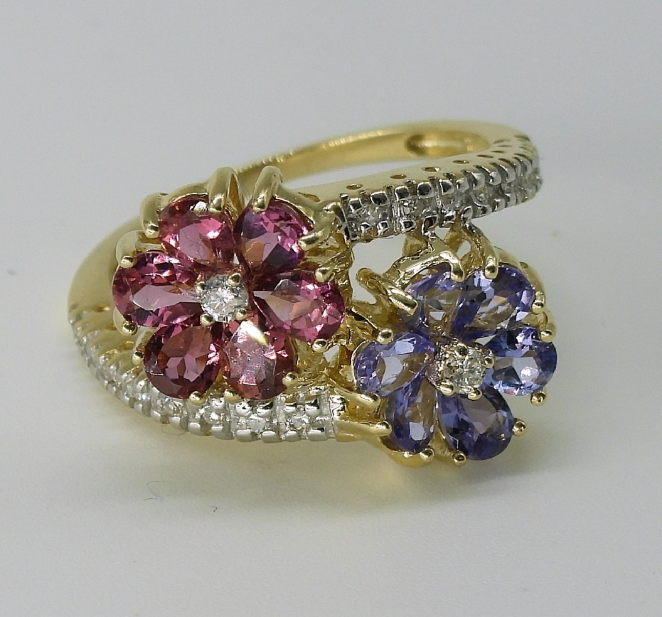 14k yellow gold flower ring. Flowers are Tanzanite and Pink Tourmaline. Side diamonds. Size 7. (2.7 dwt with gems)