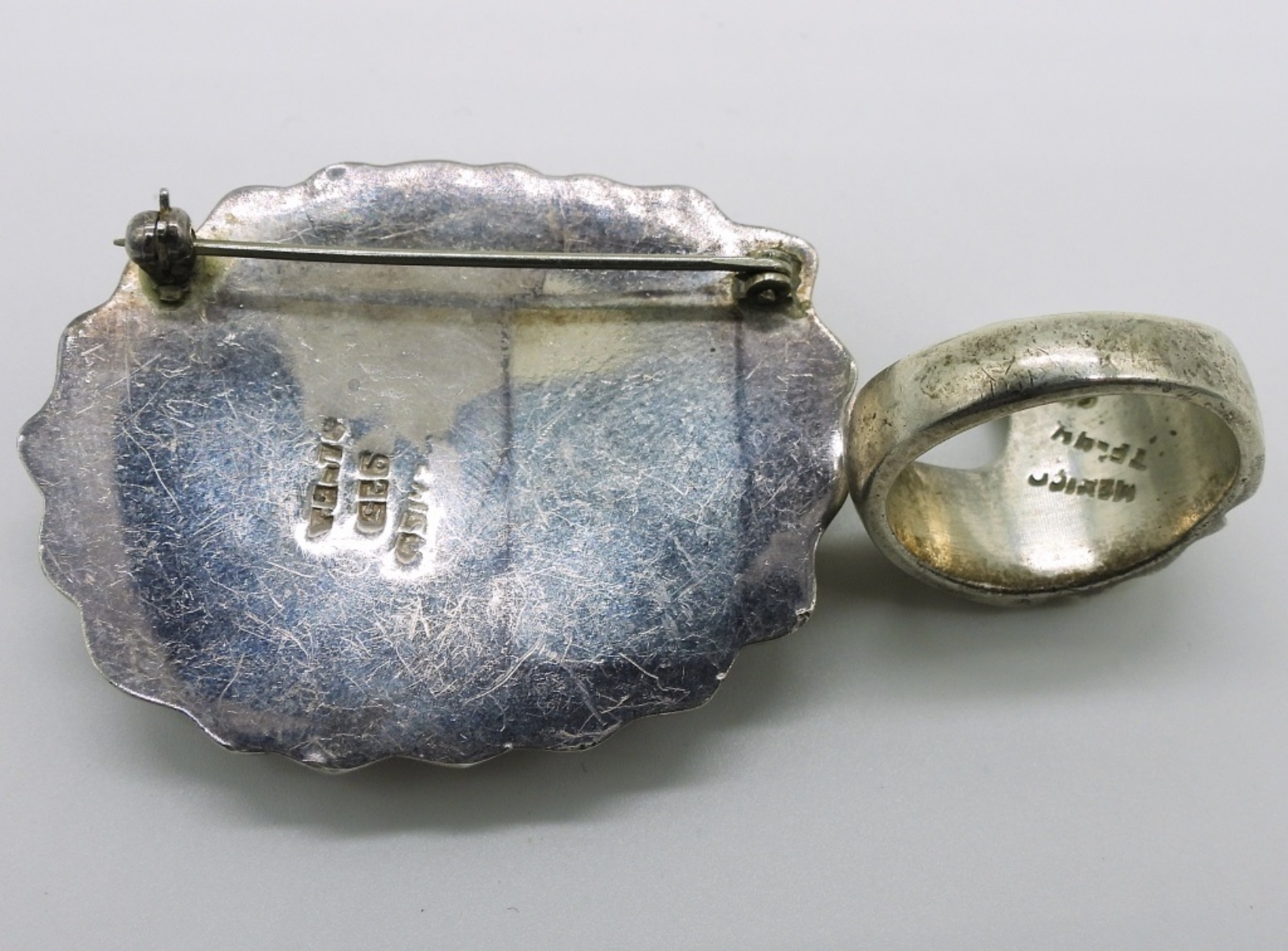 Taxco wave ring, size 8 “TF-44”. Two tone Taxco brooch, Taxco mark hard to read. Three other sterling rings, sizes 5.5-9 (29.7 dwt)