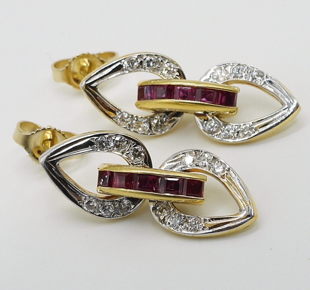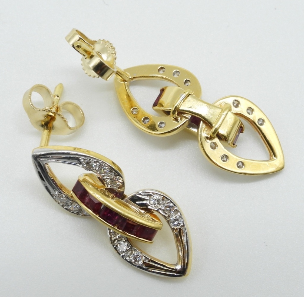 18k yellow gold pierced earrings. 24 diamonds (.24 tw), 10 square cut rubies (unknown tw). 1″ long.