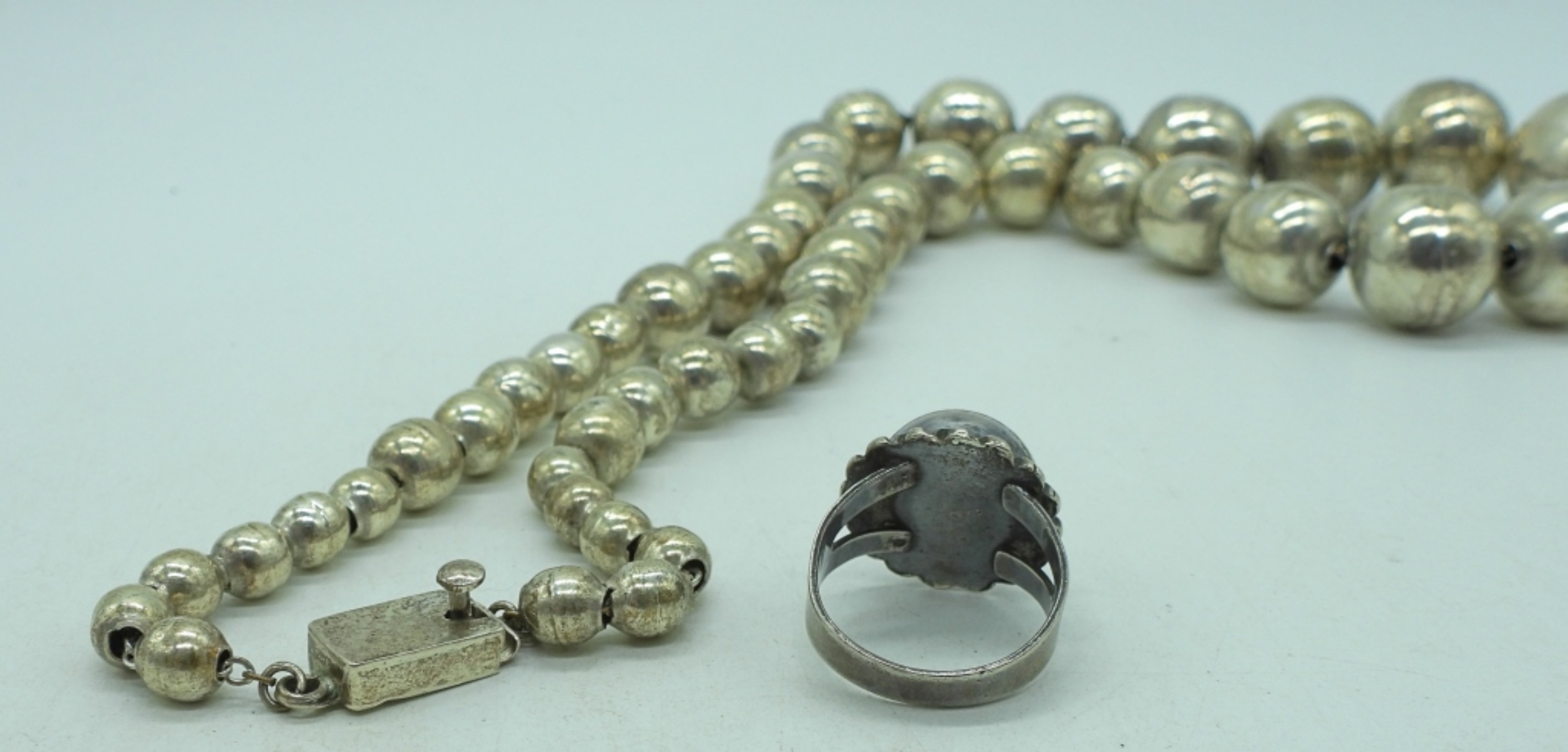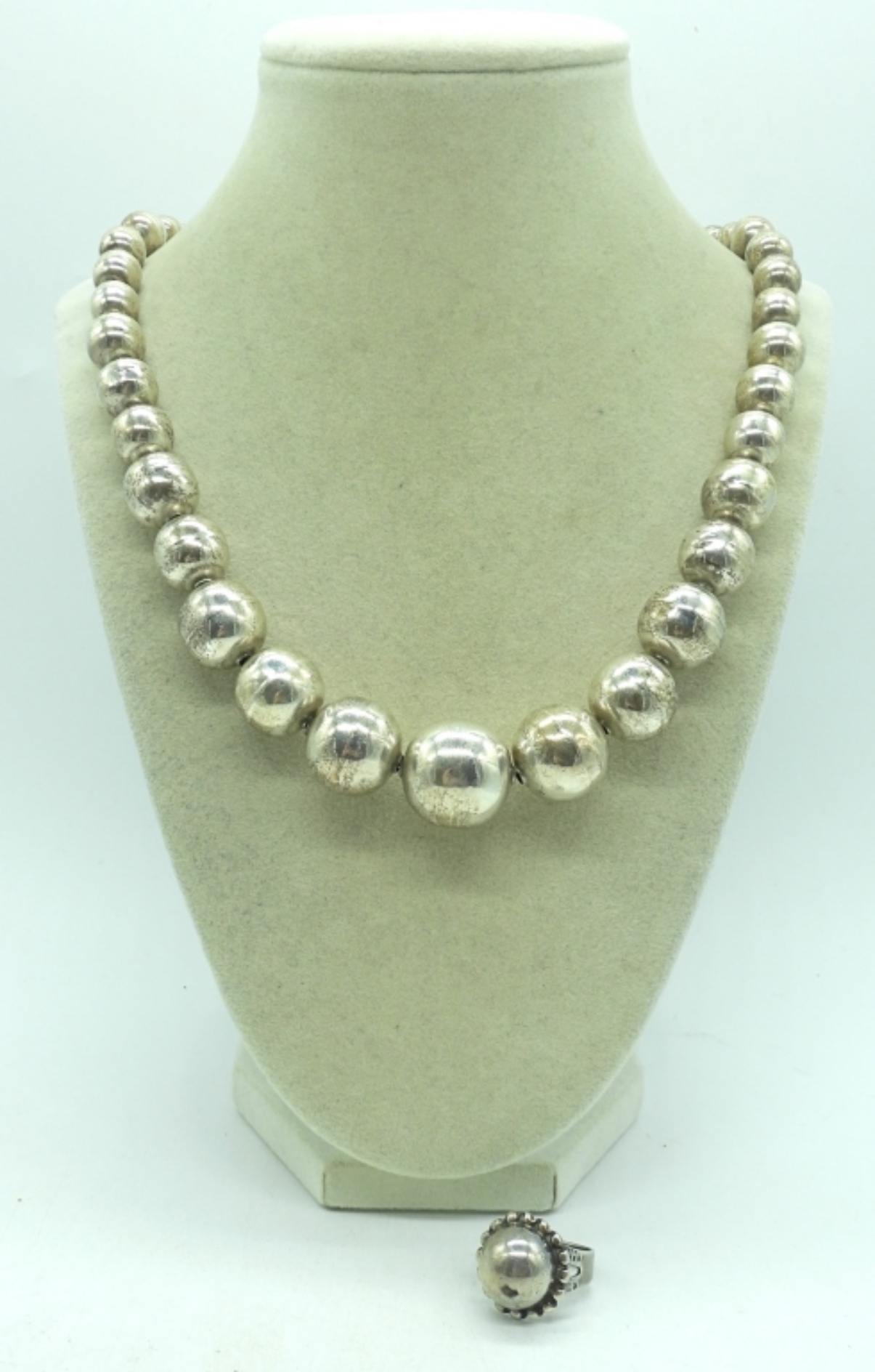 22″ sterling graduated ball necklace. Marked “sterling Mexico 925 TCC”. Cute sterling ring, size 6.5 (36.9 dwt)