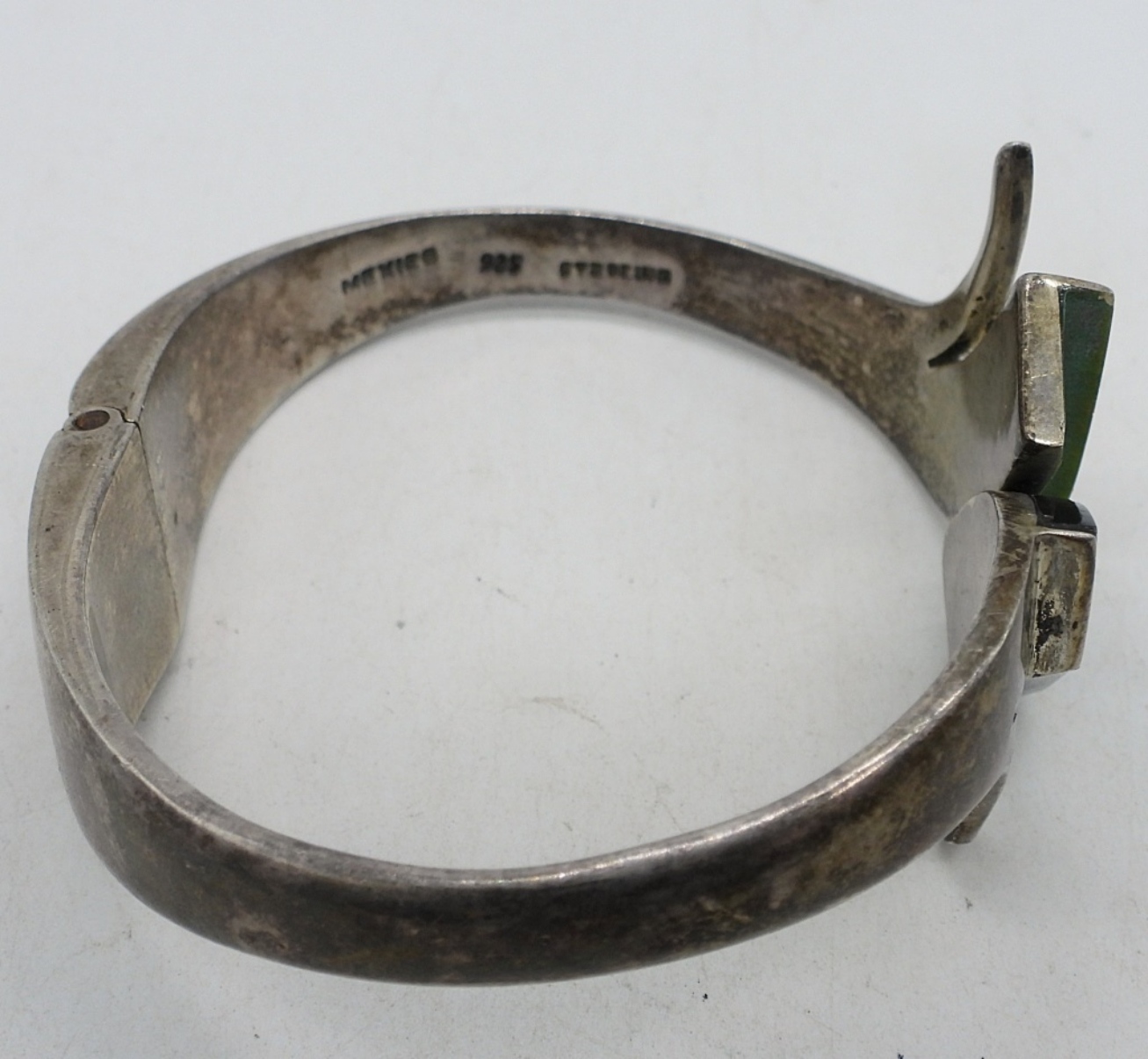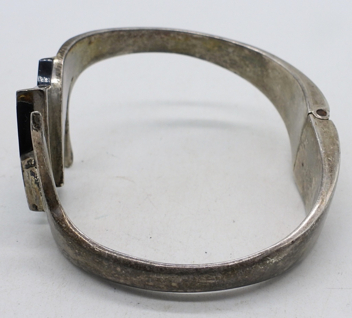 Mexico sterling bracelet with onyx & malachite hinged bracelet. Missing one malachite gemstone. (34.9 DWT)