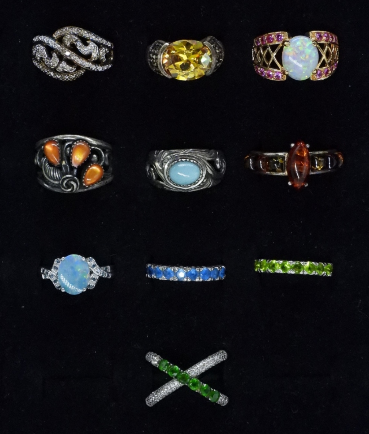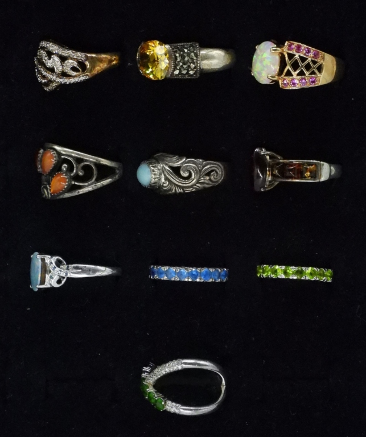 Ten sterling rings. Amber, Opal, Citrine, Simulated Diamond. Sizes 6-8 (31 dwt)