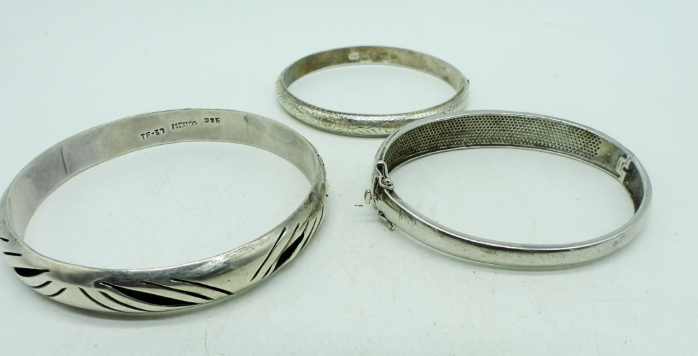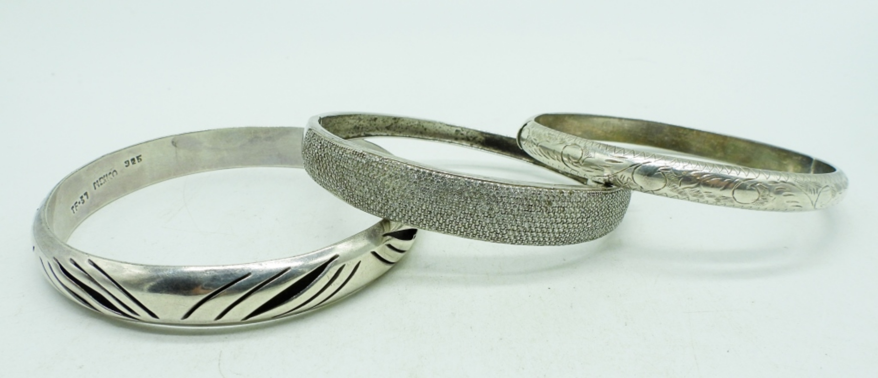Taxco Sterling Bangle Bracelet marked “TF-37 Mexico 925”, 8 “. Simulated diamond encrusted (missing some stones) hinged bracelet and an etched sterling bangle. (26.4 dwt)