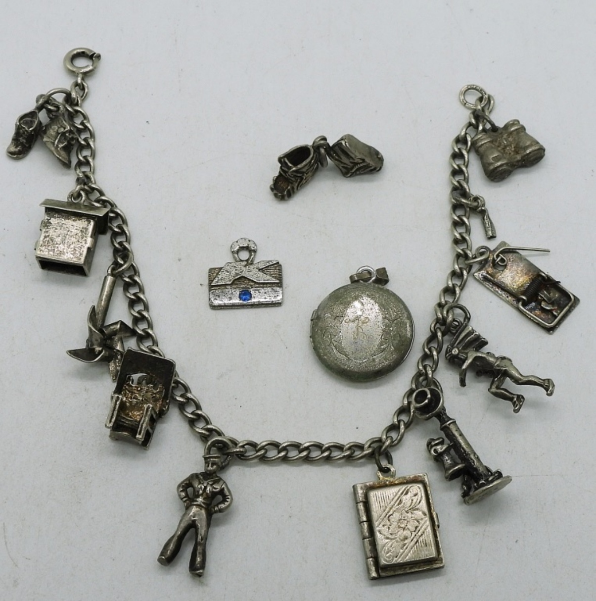 Petite vintage sterling charm bracelet with 13 charms. 7″ long. (15 dwt)