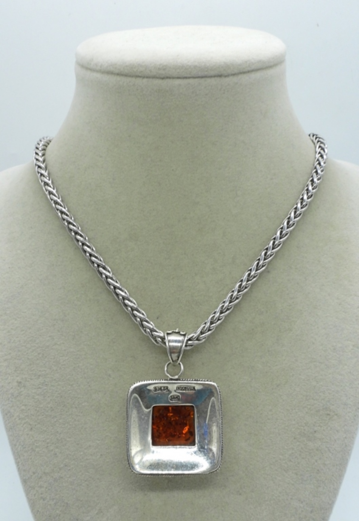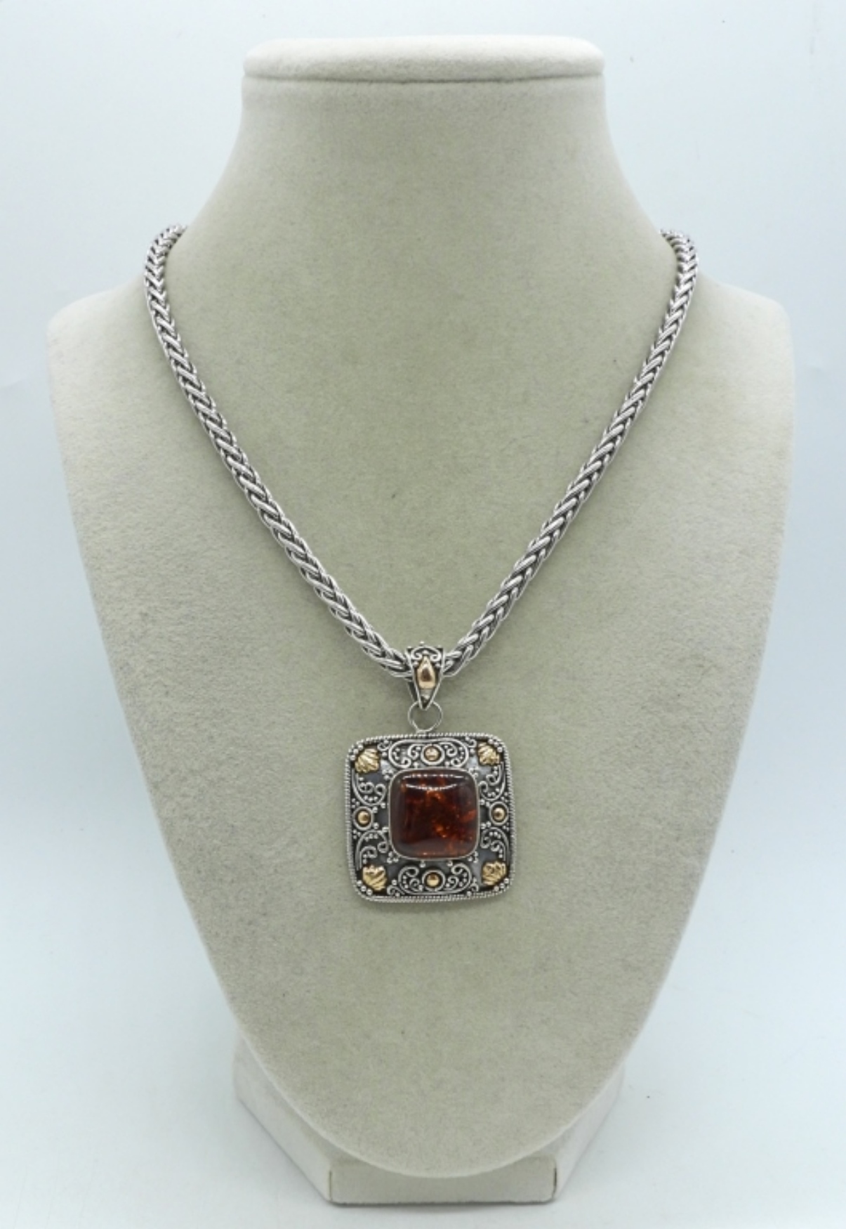 Sterling Amber pendant with 18k accents. On a 18″ thick sterling chain. Marked 925, 18k, Indonesia (19.1 dwt)