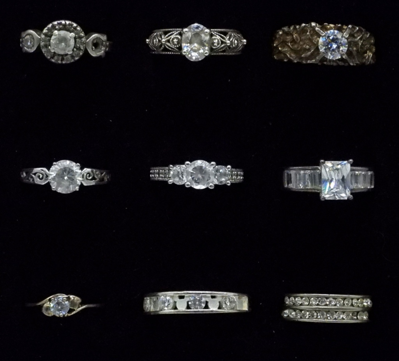 Nine bridal style rings with simulated diamonds. Sizes 6-12. (21.2 dwt)