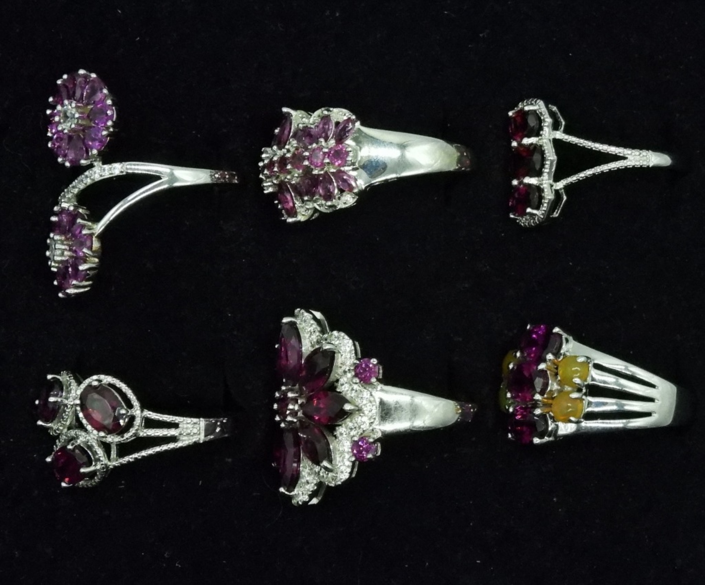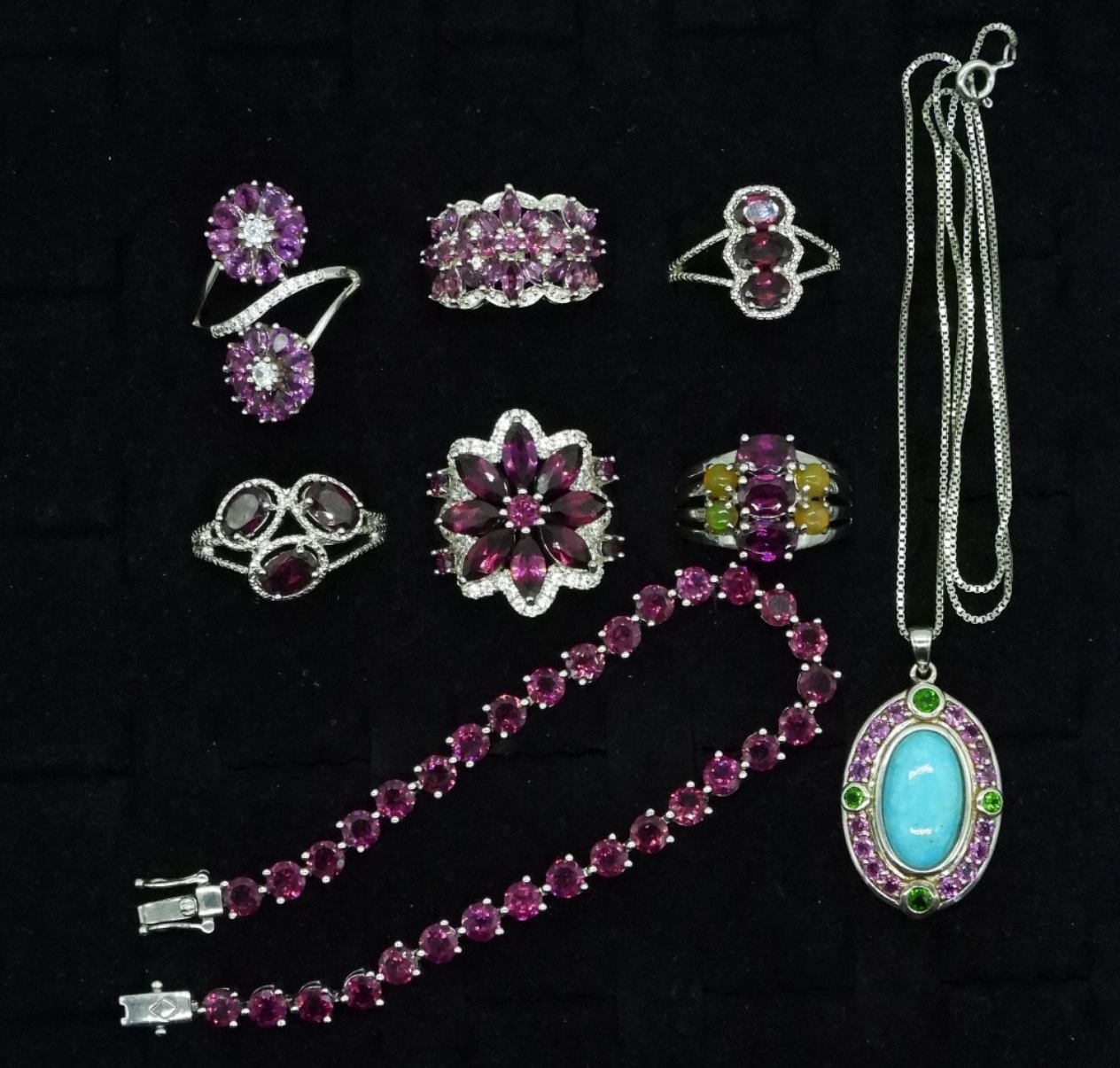 Rhodolite Garnet Set. Six rings, sizes 9, 10, 11. Bracelet is 7.5″. Necklace has turquoise, rhodolite garnet & unknown green gem. Chain is 18″. (30 dwt)