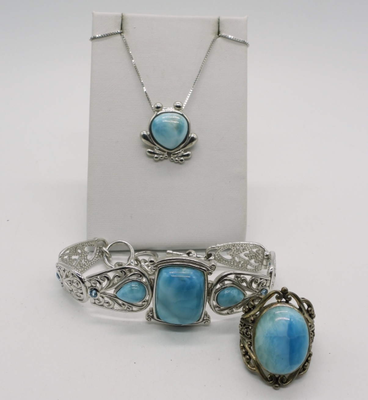 Cute sterling larimar frog necklace, 20″. Bracelet 6-8″ toggle clasp. Ring size 7. (30 dwt)