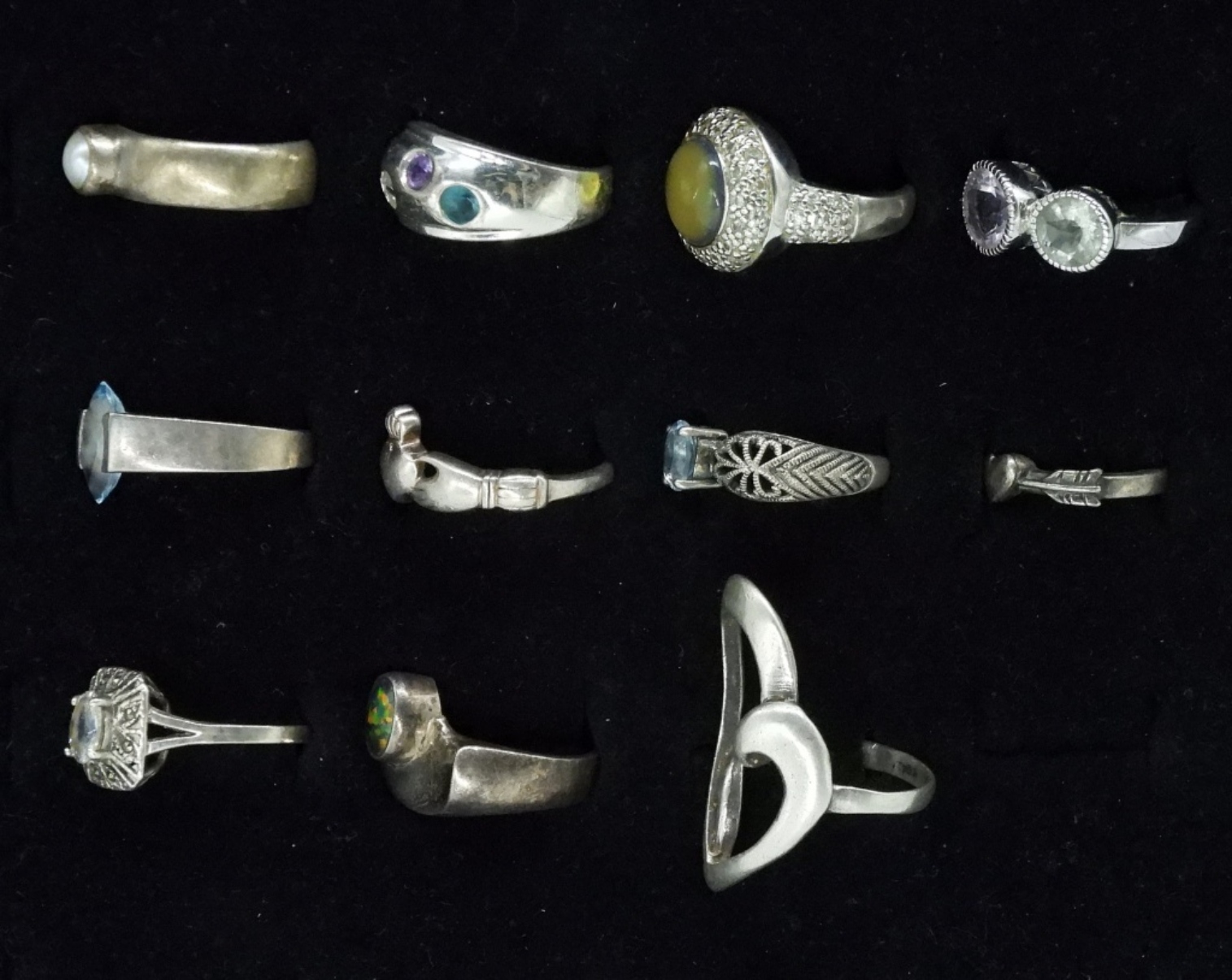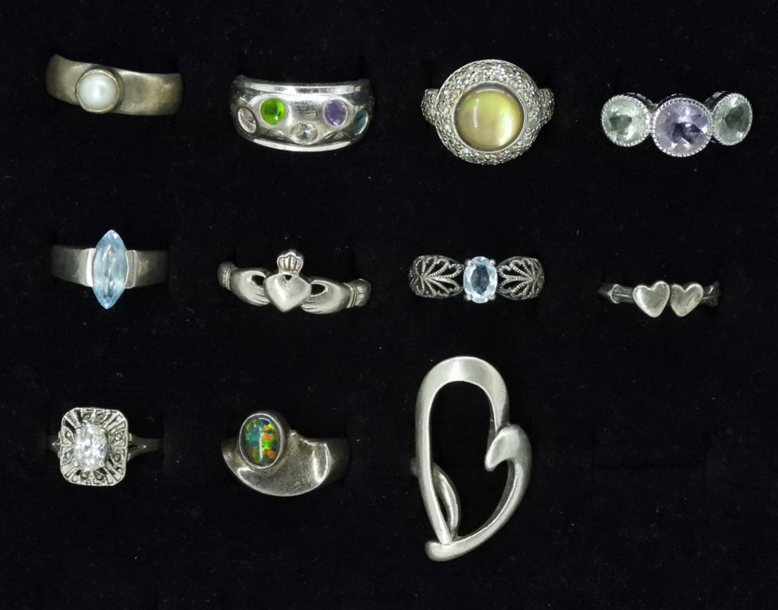 Sizes 5-10. Simulated Diamond, Blue Topaz, Pearl, Amethyst. (34.4 dwt)
