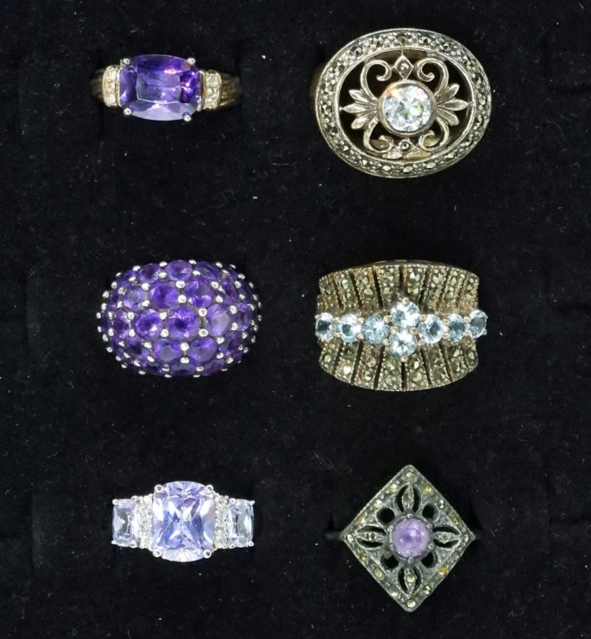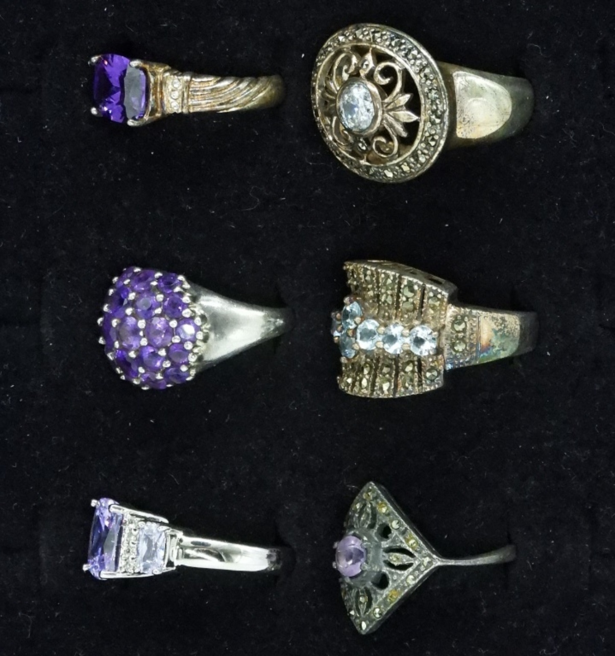 Six sterling rings, Amethyst and Blue Topaz gemstones. Sizes 6-8 (26 dwt)