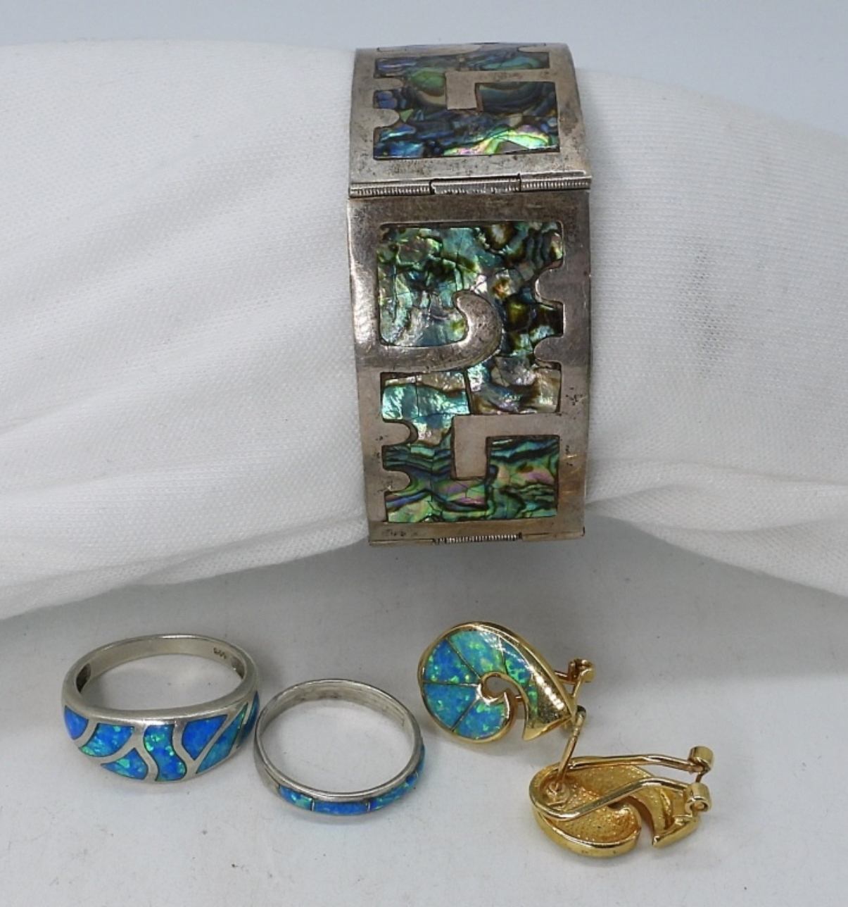 Abalone sterling Mexico bracelet, 7″. Two sterling rings with opal inlay, sizes 7, 9. Sterling gold tone pierced earrings with opal inlay. (22.7 dwt)