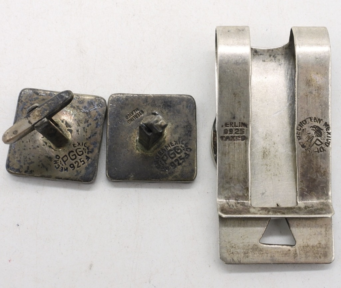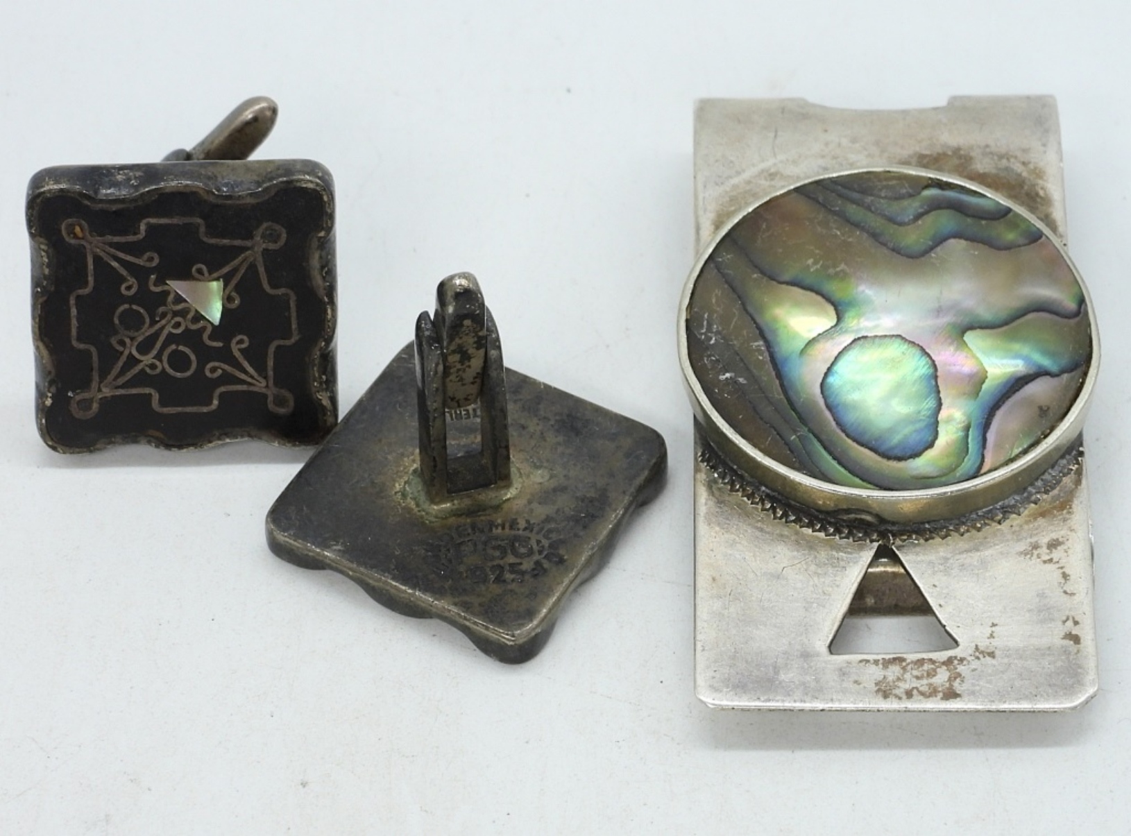 Taxco Abalone inlay sterling money clip. Marked “Sterling 0925 Taxco / MAP”. 2.5″ long. Mexico sterling abalone inlay cuff links. (22.6 dwt)