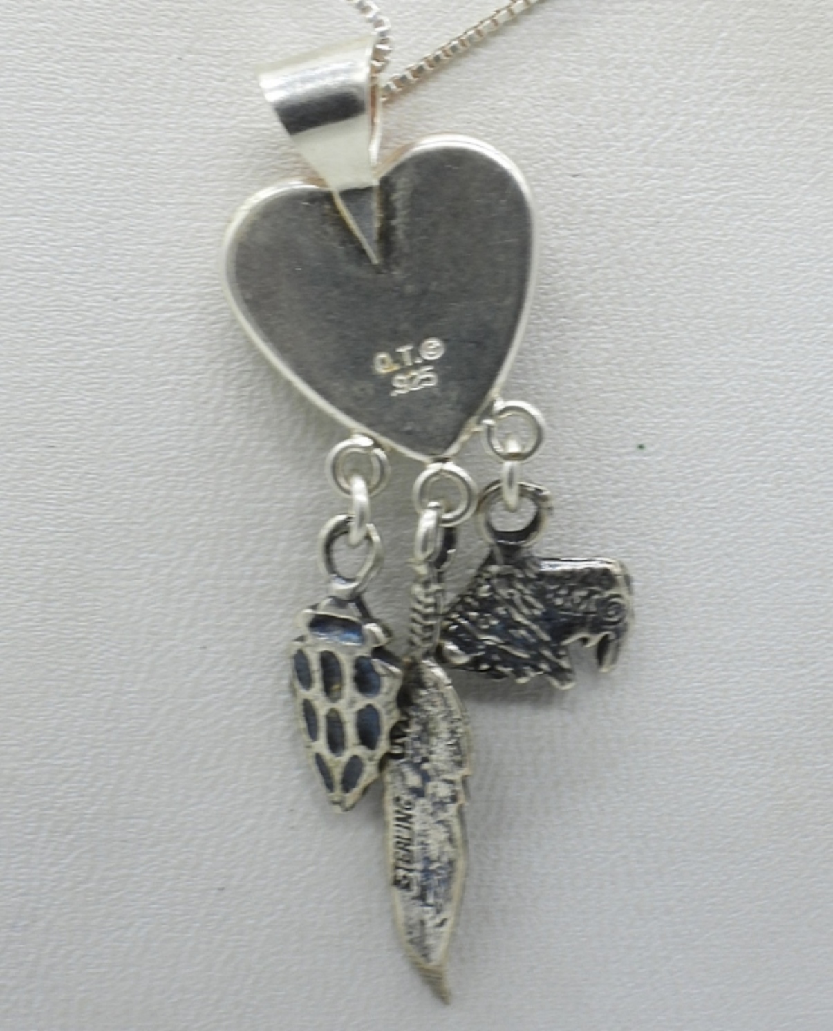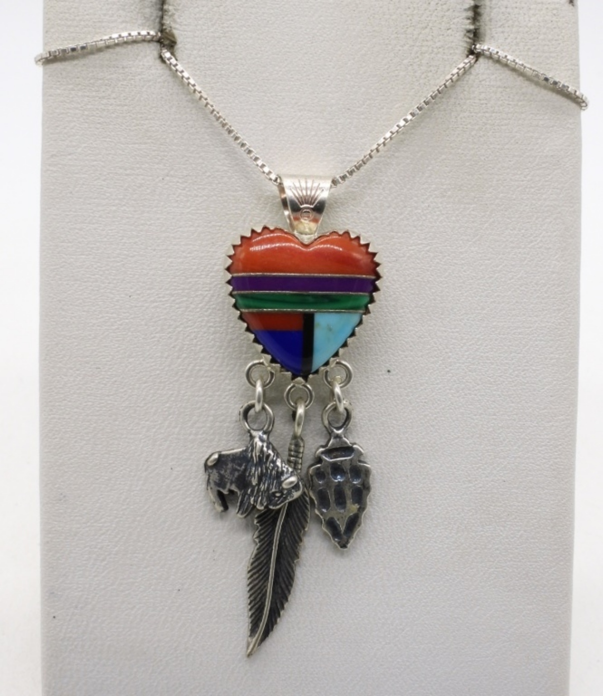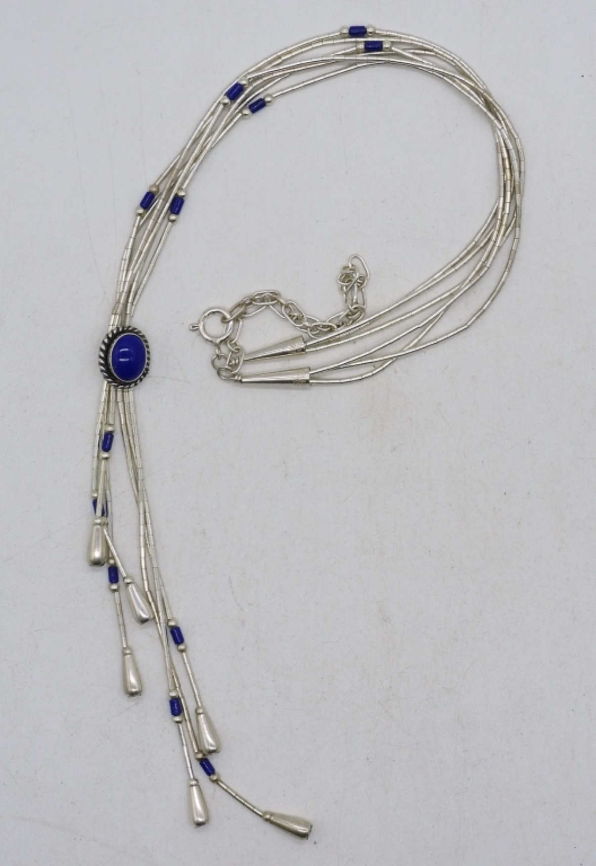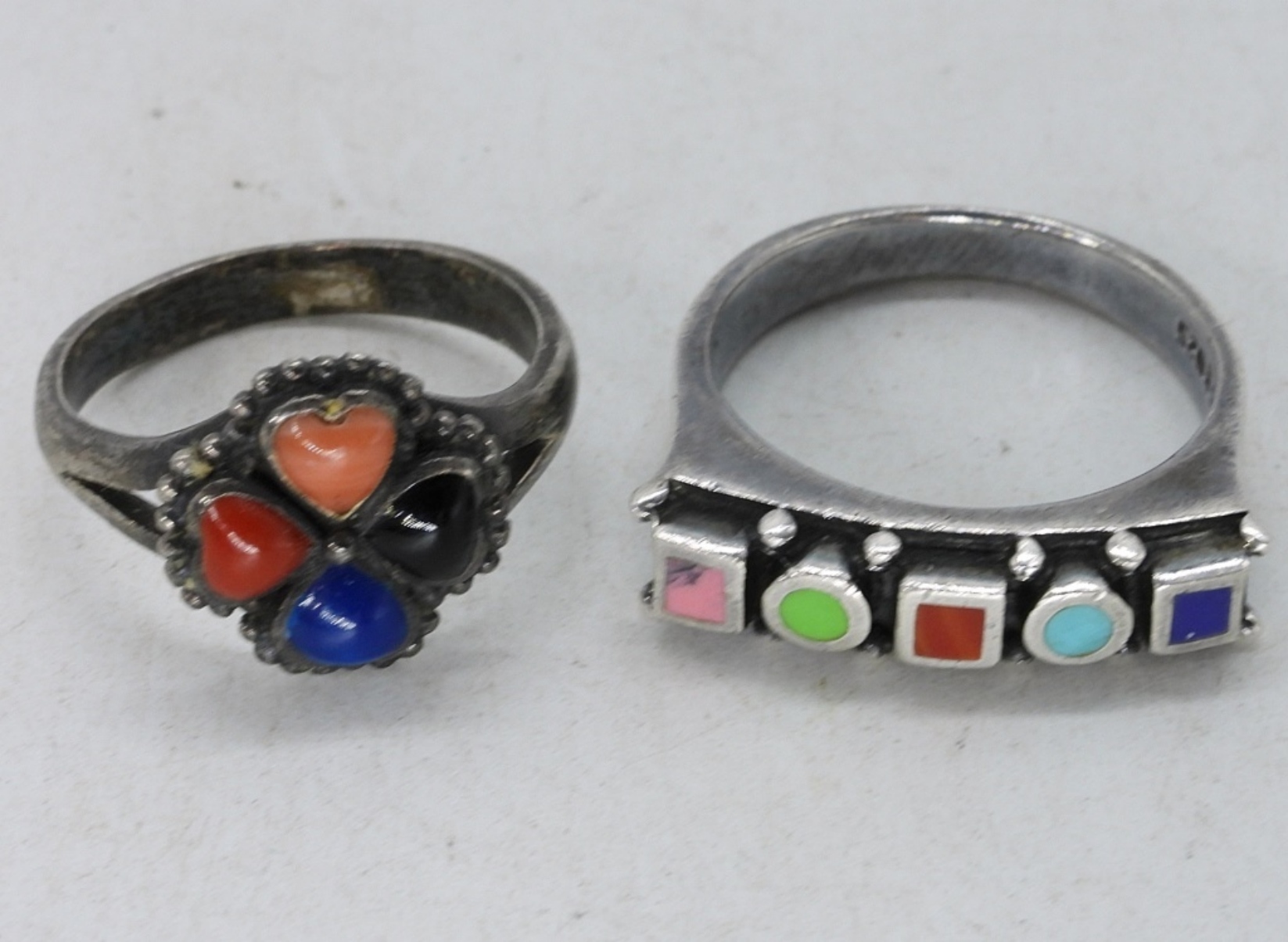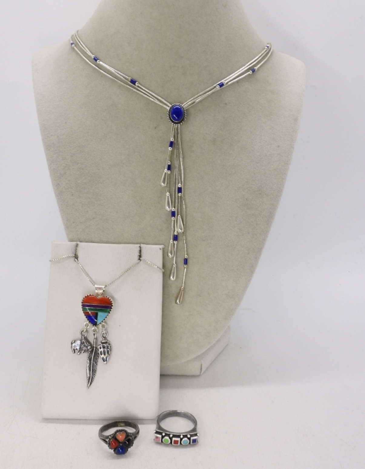 Liquid sterling necklace with lapis lazuli gemstones, 20″ adjustable. Multi gemstone heart necklace, 18″. Two sterling rings, sizes 6.5 & 8. (17 dwt)