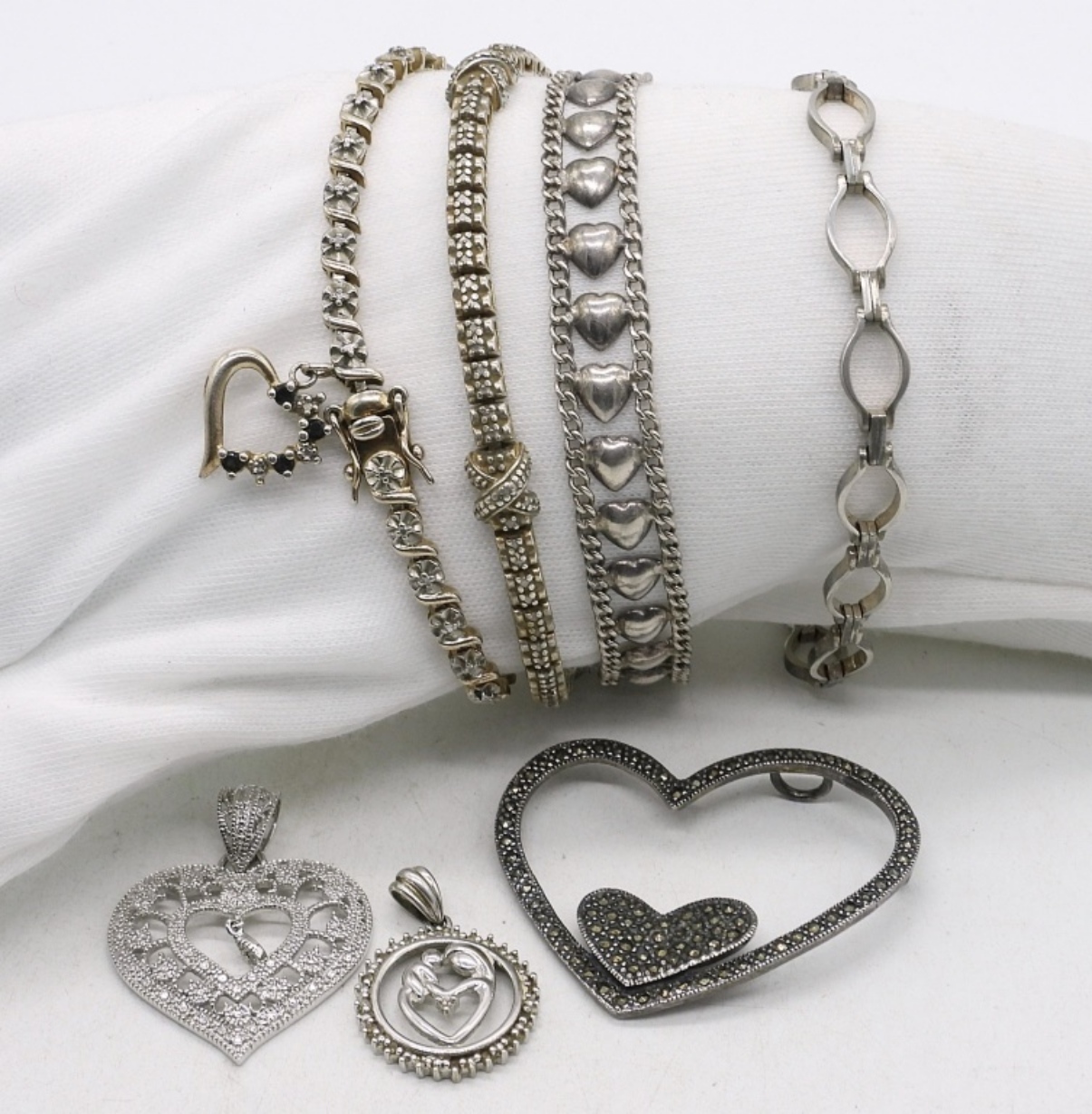 Four sterling bracelets, 7-8″ long. Three sterling / marcasite heart pendants. (30.3 dwt)