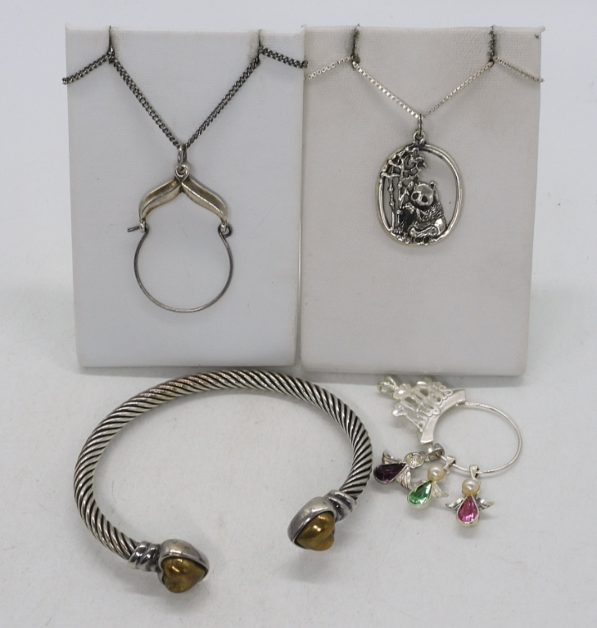 Two pendant charms, with three angel charms. One panda pendant. Two sterling chains, 18″ & 24″. Sterling heart cuff bracelet, 7-9″. (28.9 dwt)