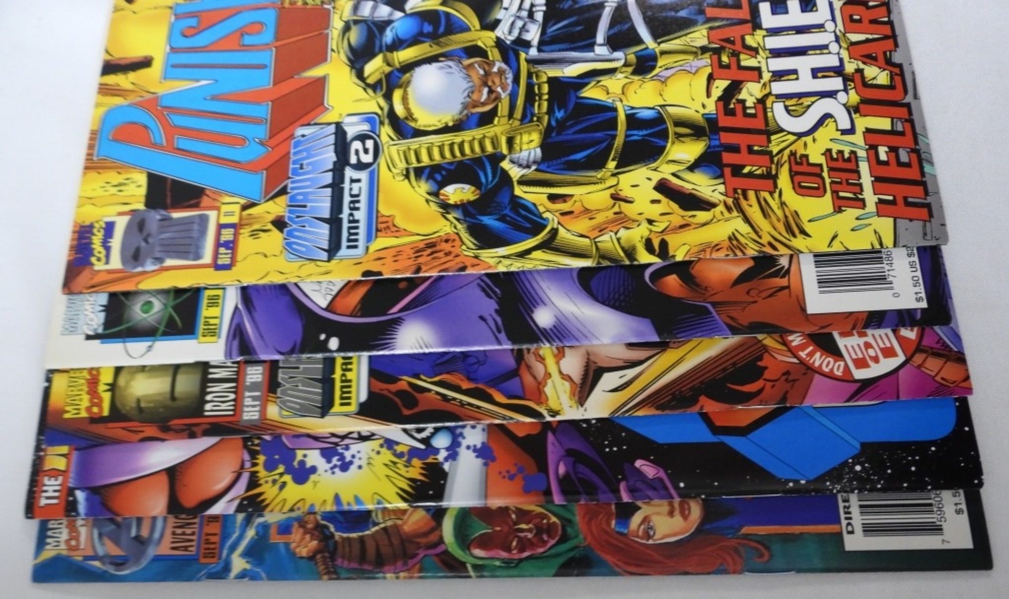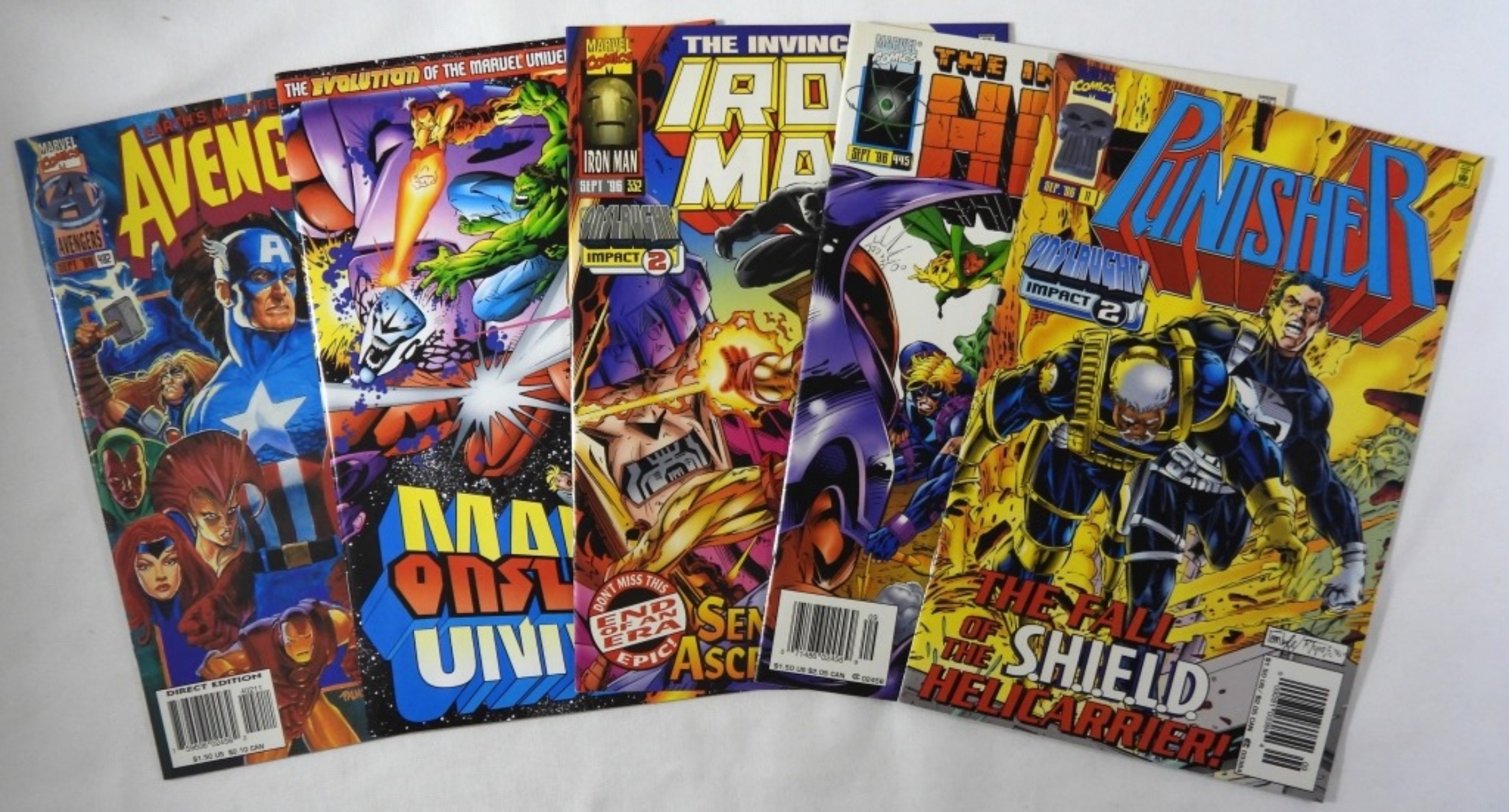 The Invincible Iron Man #332, The Incredible Hulk #445, Punisher #11, Avengers #402, and Marvel Universe Onslaught, 1996, VG-F