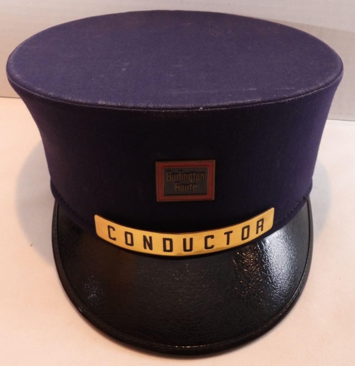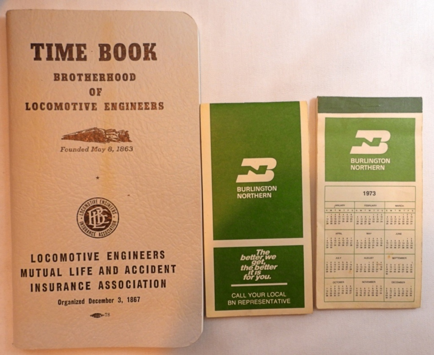 Vintage railway hat, original badges, and some wear. Has two Burlington Northern notepads, one has some paper missing, and also comes with a Brotherhood of Locomotive Engineers Time Book.