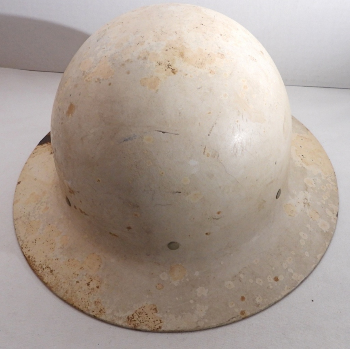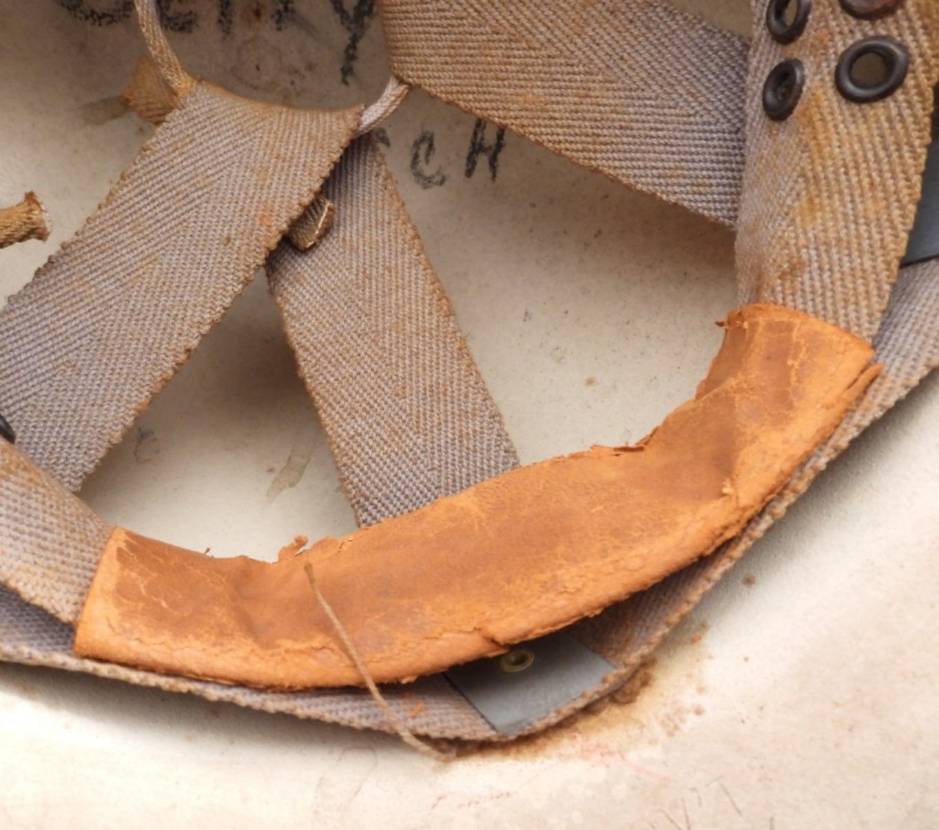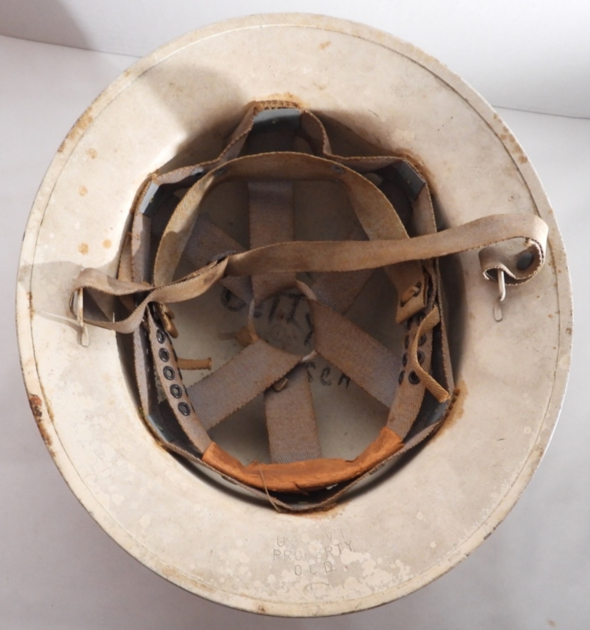 The U.S. Civil Defense helmet shows some paint wear and rust. The leather band on the inside has some deterioration, and a name is written on the inside of the helmet.