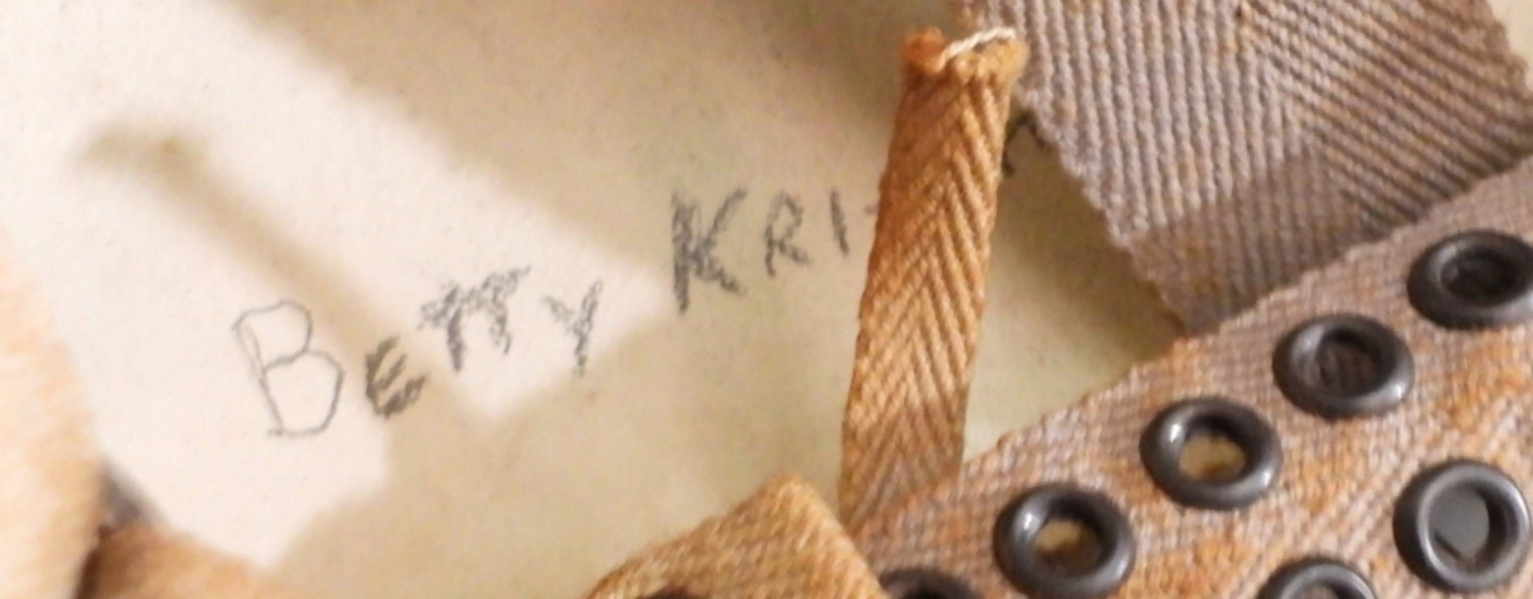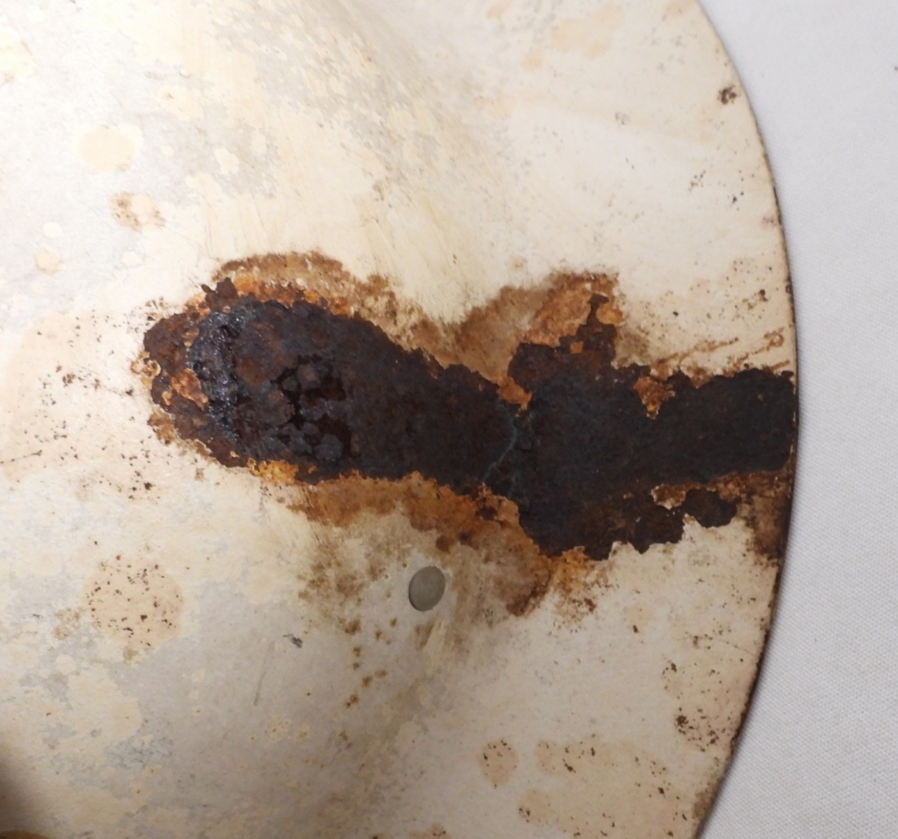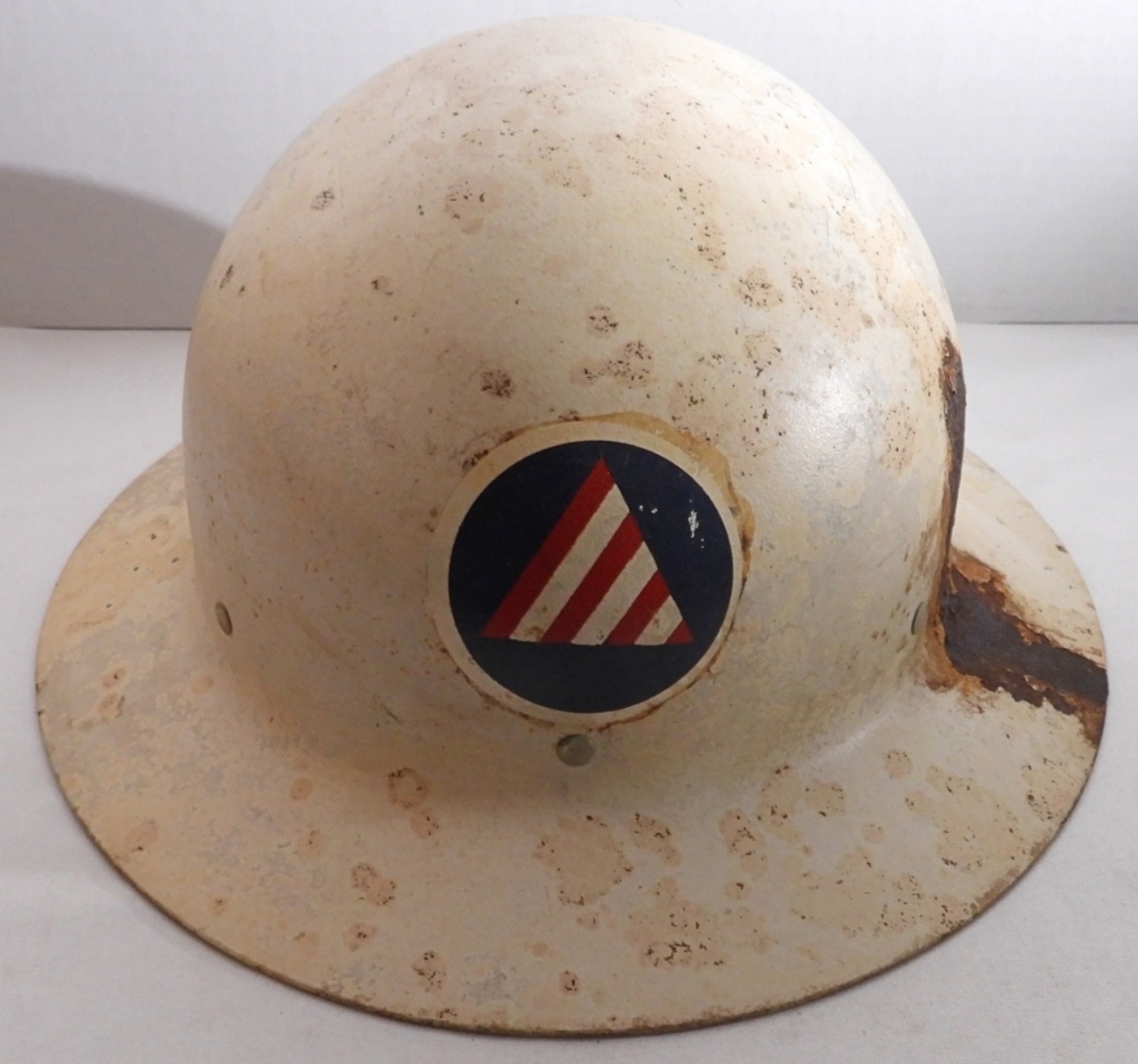 The U.S. Civil Defense helmet shows some paint wear and rust. The leather band on the inside has some deterioration, and a name is written on the inside of the helmet.