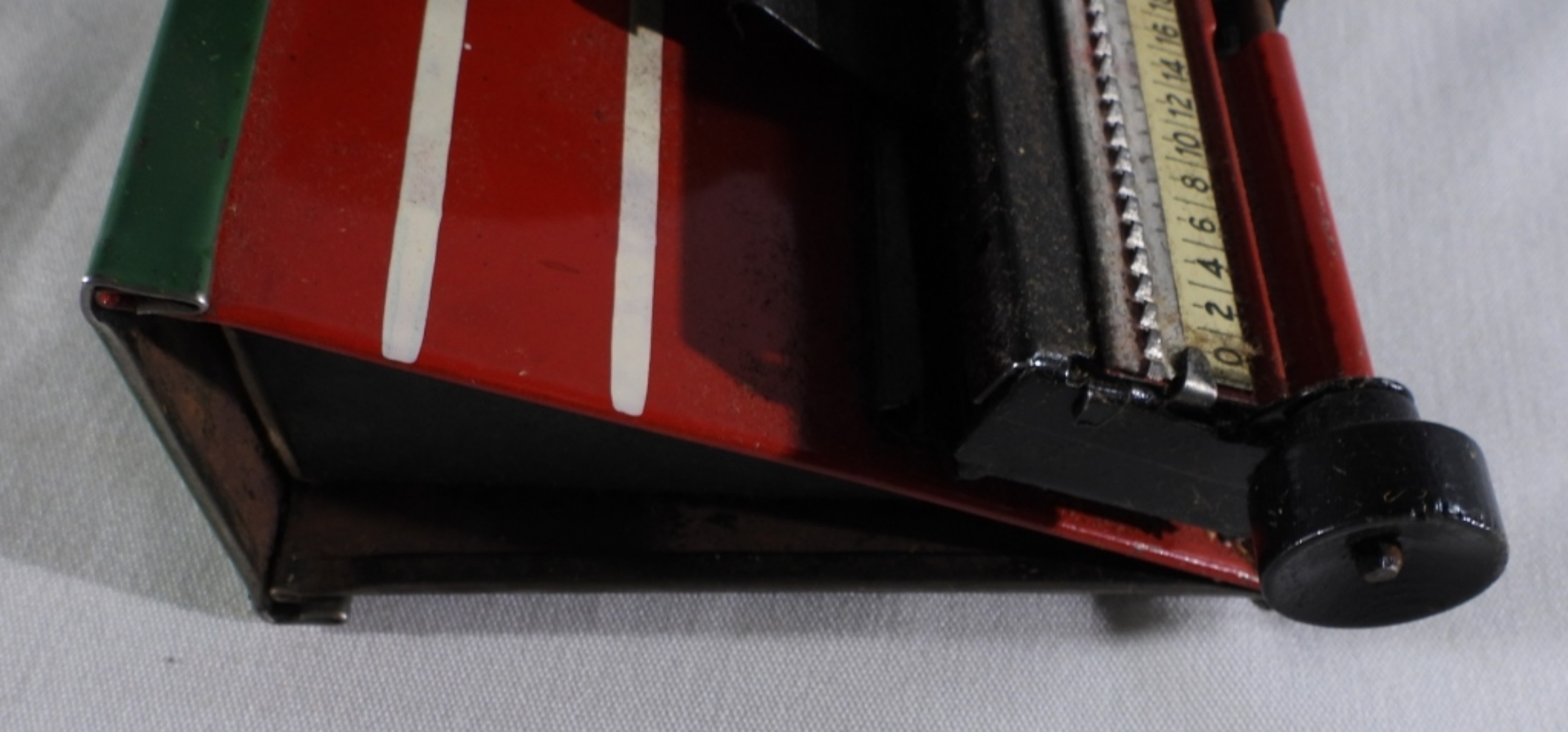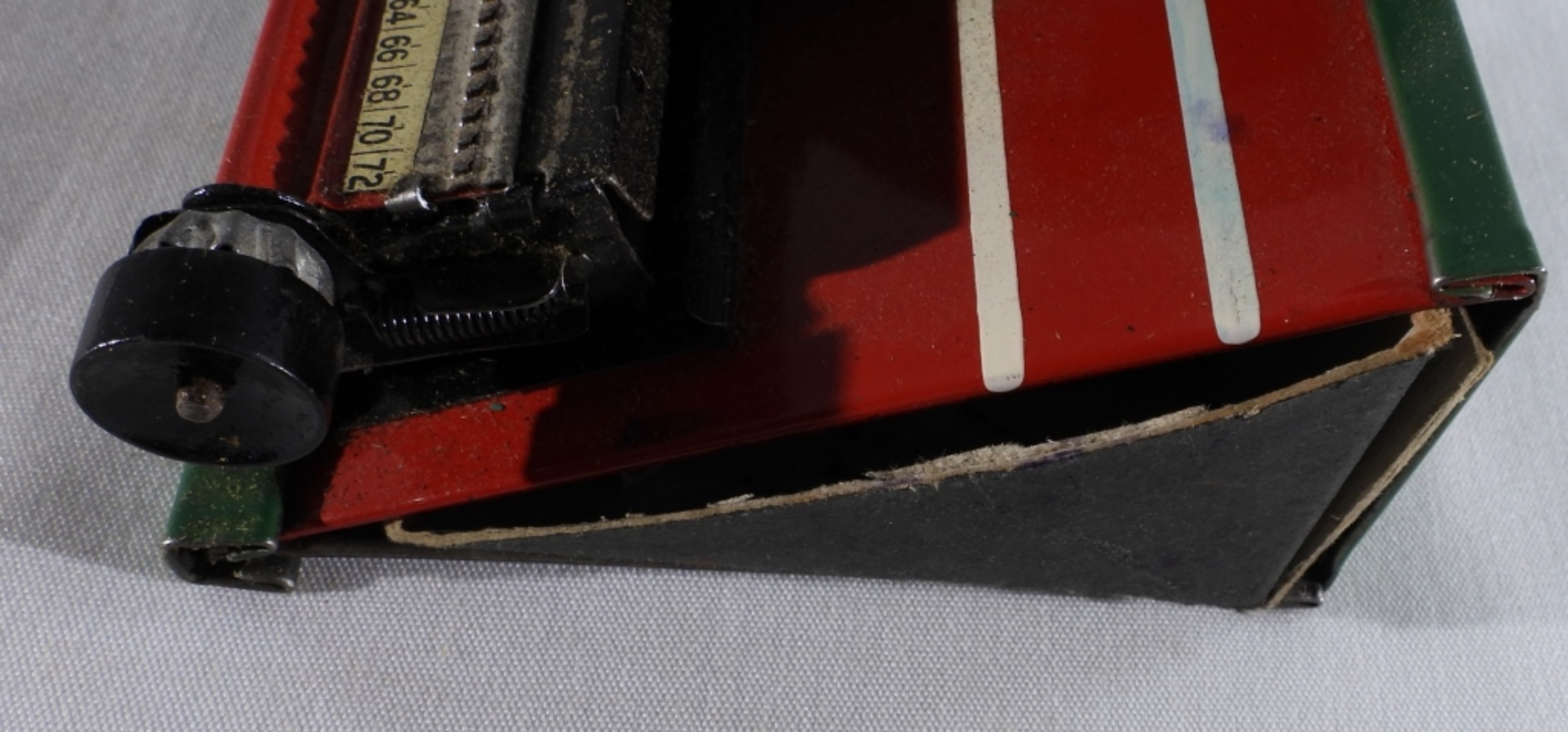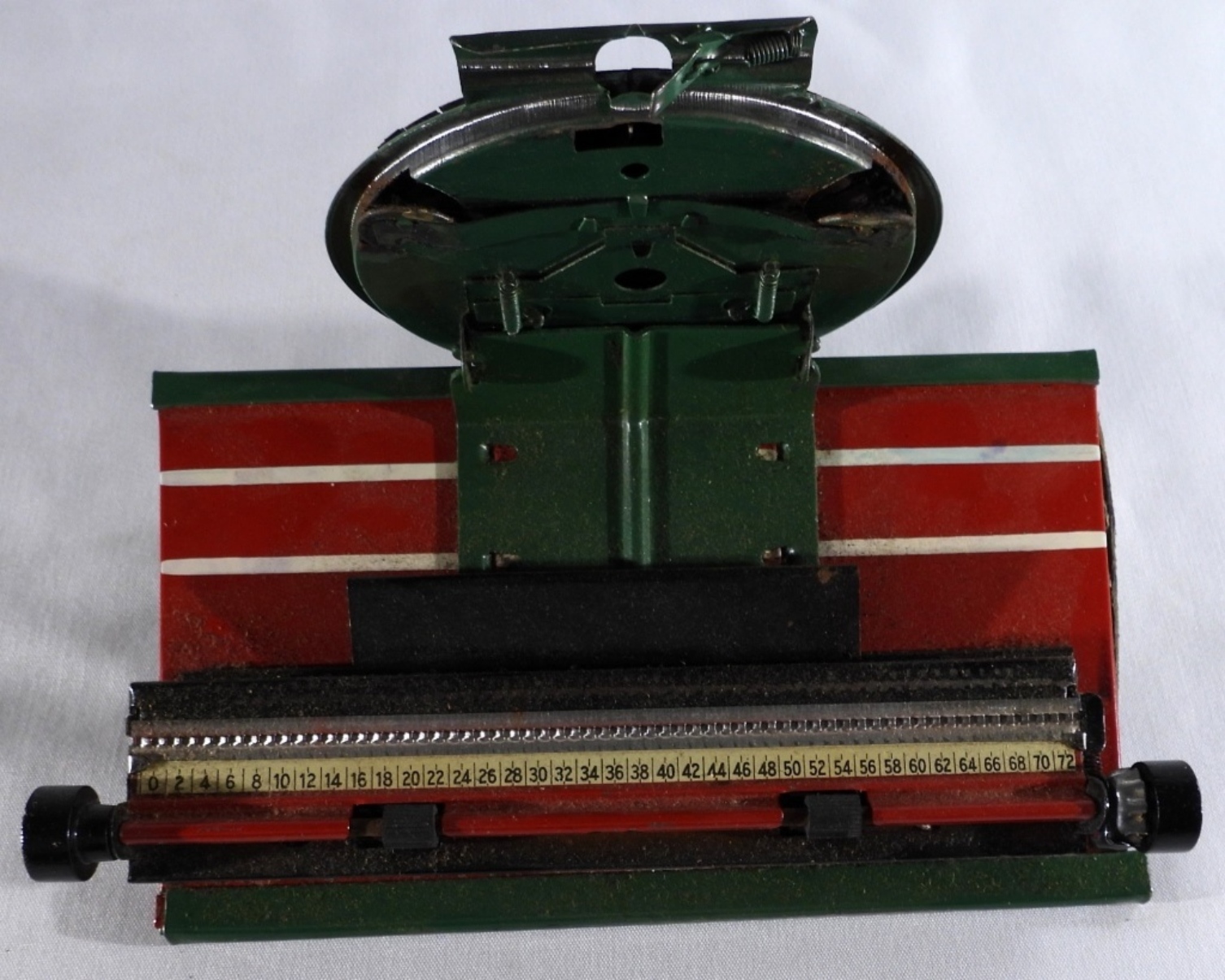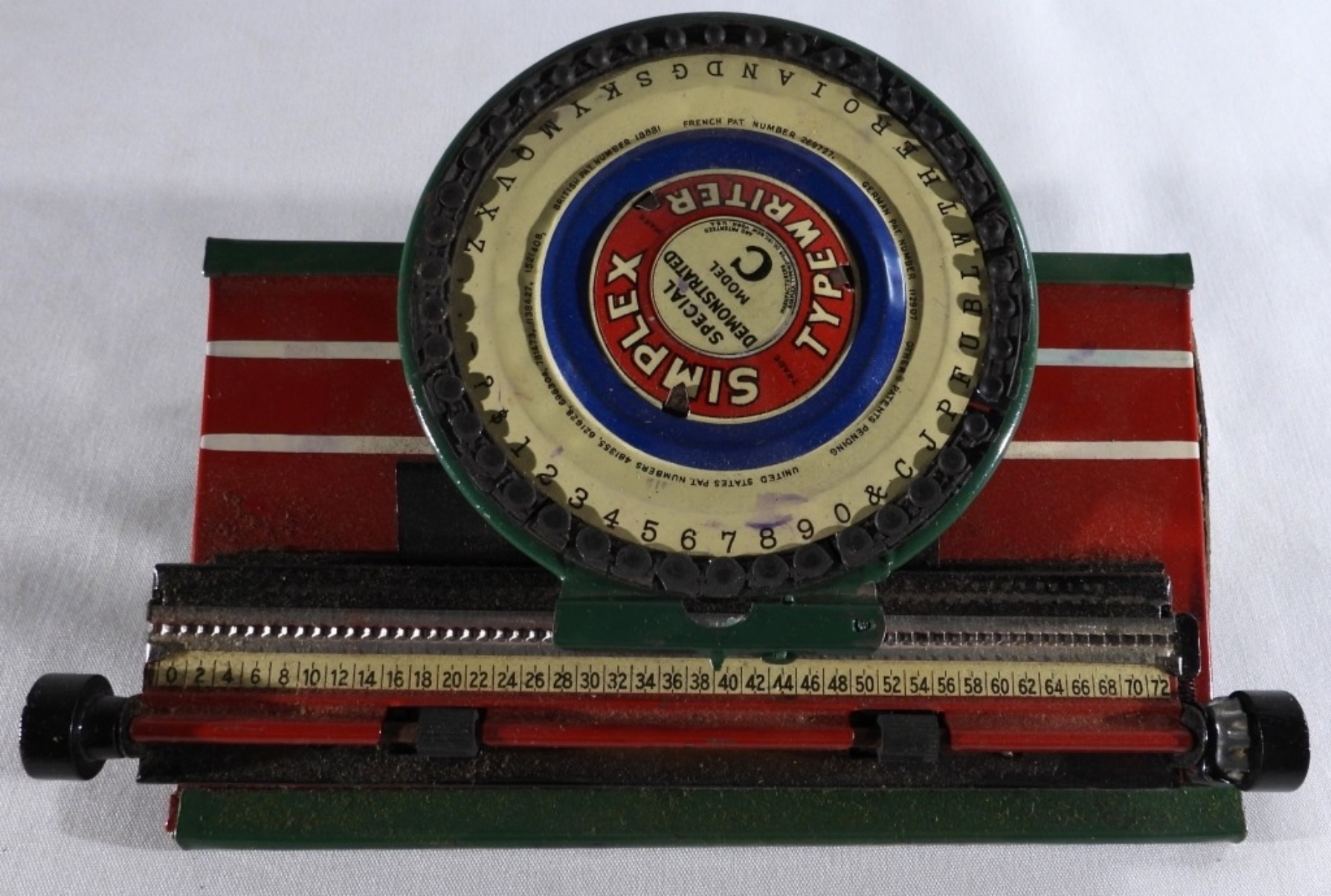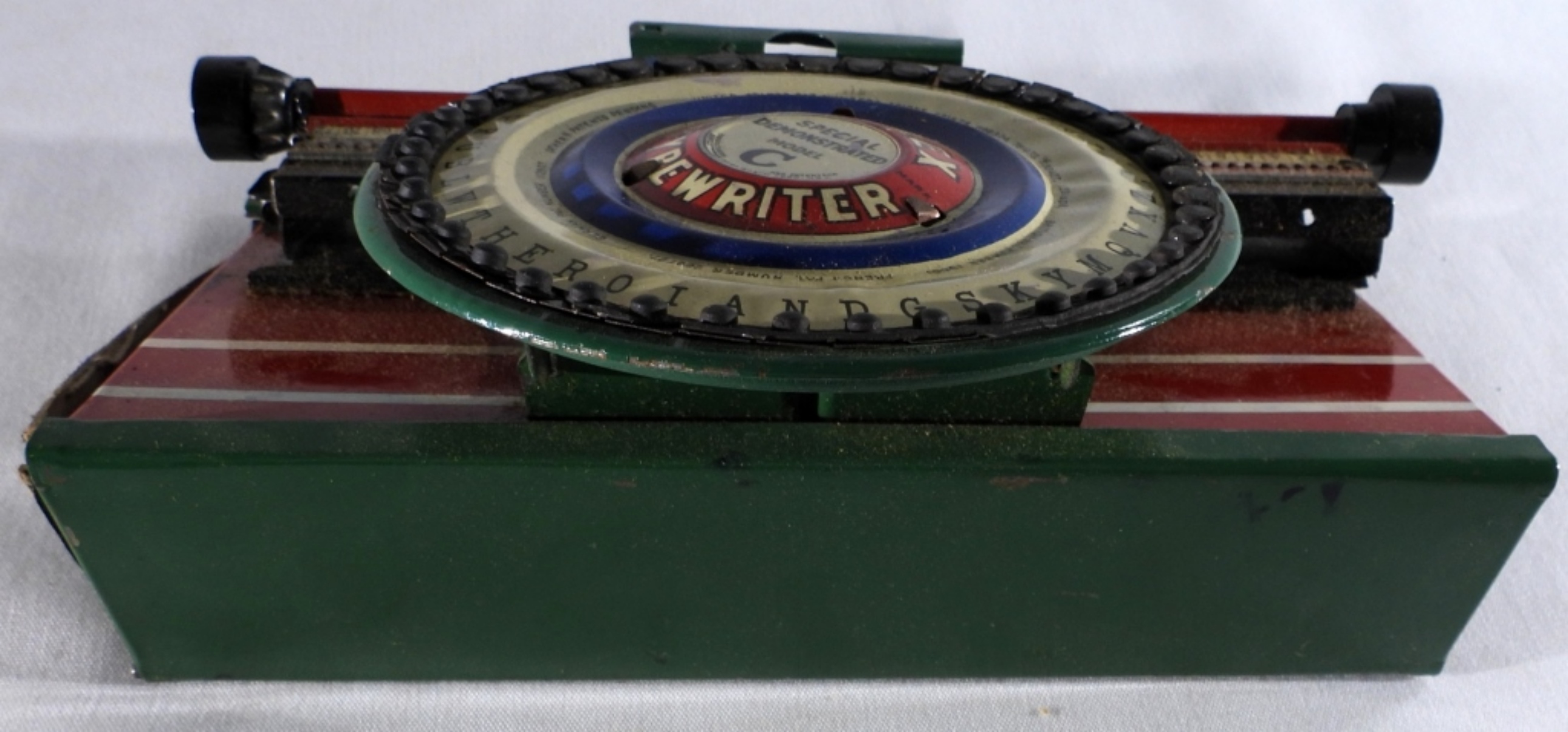 Still in its original box, “Special Demonstrated Model C”. With numbers and uppercase letters. Still turns and moves. The dials under the letter are worn from the years.