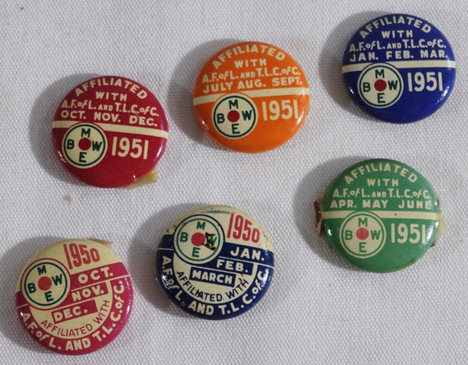 Brotherhood Of Maintenance Of Way Employees Affiliated with A.F. of L. and T.L.C. of C. Union due pins. Has some glue residue on the back. 2-1950 October- March, 4-1951 January-December. L.J. Imber CO.
