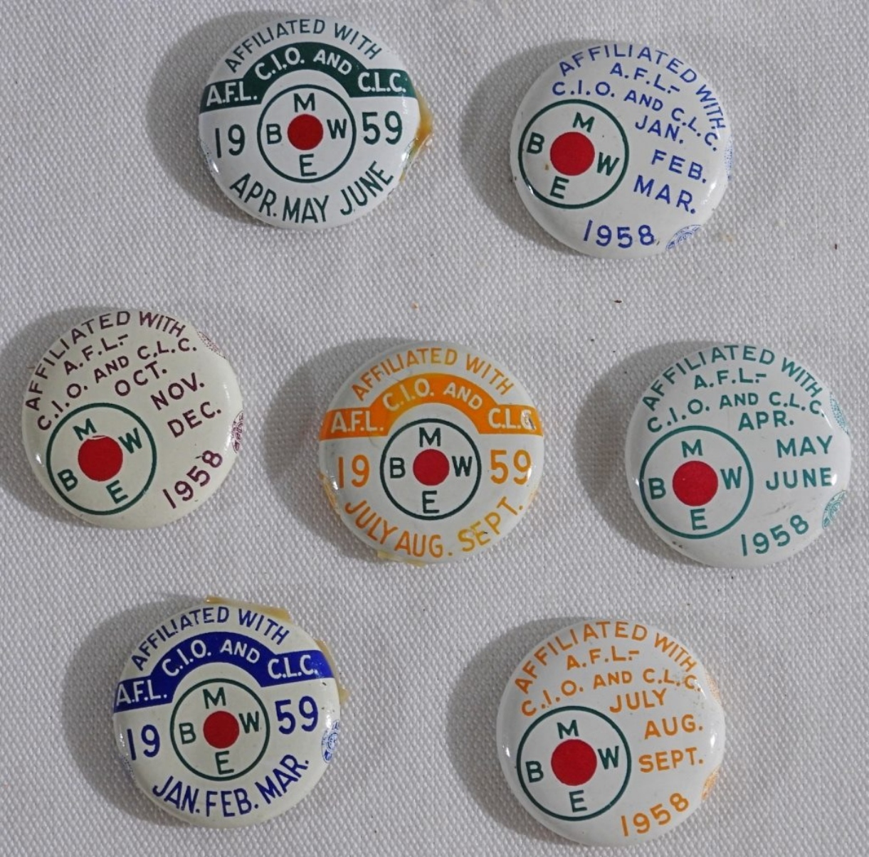 Brotherhood Of Maintenance Of Way Employees Affiliated with A.F.L.- C.I.O and C.l.C. Glue residue. Nothing is marked on the back of the pins. 4-1958 January-December. 3- January- September