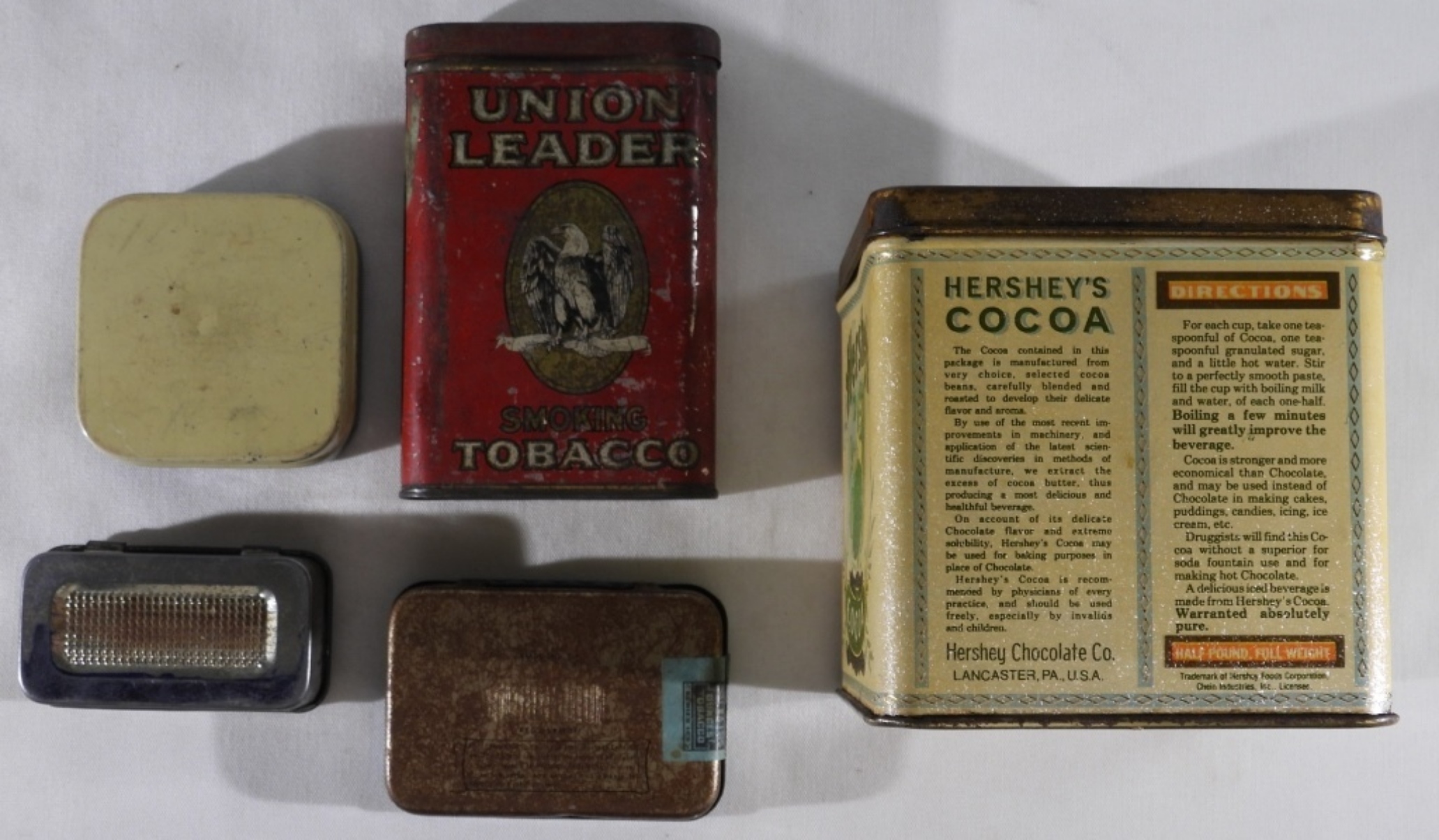 1- Hershey’s Cocoa, 1- Fine Service Brand, 1- Union Leader Smoking Tobacco, 1-Edgeworth Extra High-grade Sliced Pipe Tobacco, and 1- Bell’s Waterproof Wax Vestas. All tins are empty