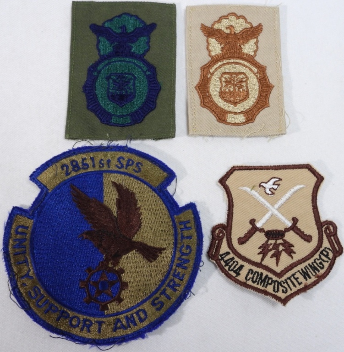 1) 4404 Composite wing (P) 2)2861st SPS Unity Support and strength. 3) Air Force Security Police Shield. 4) U.S. Air Force Police camouflage patch.