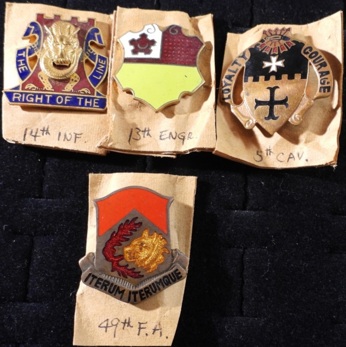 1)U.S. Military 14th Infantry Regiment Crest DI Pin Back DUI THE RIGHT OF THE LINE 2)13th Engineer Battalion 22M Unit Crest, DI, DUI 3) 25th Field Artillery Battalion Unit Crest Pin DUI TACE ET FACE. 4) 5th Cavalry Regiment