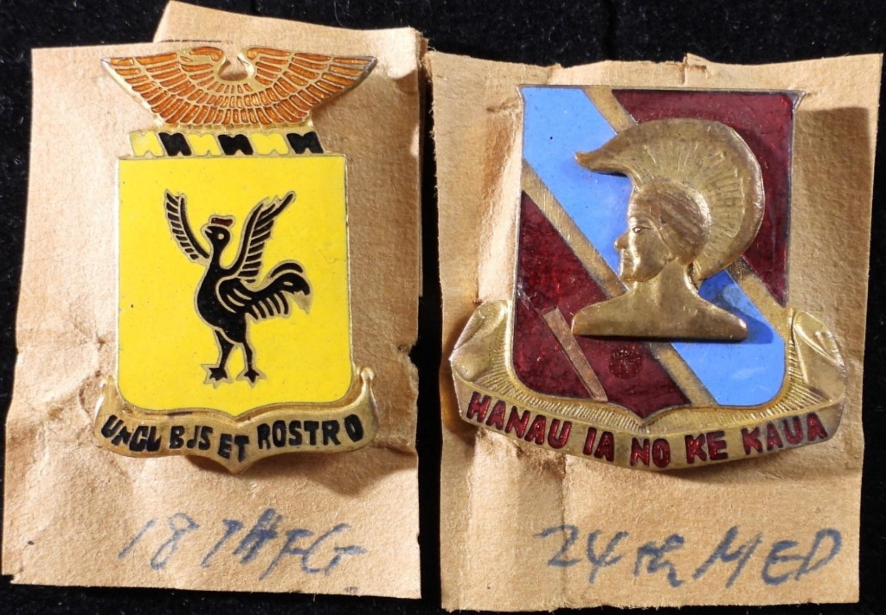 1) 63rd Field Artillery Battalion Crest “HANAU IA No KE Naua” is Hawaiian for “Born to Battle.” 2) 18th Fighter Group Crest “UNGUIBUS ET ROSTRO” is Latin for “With Talons and Beak”