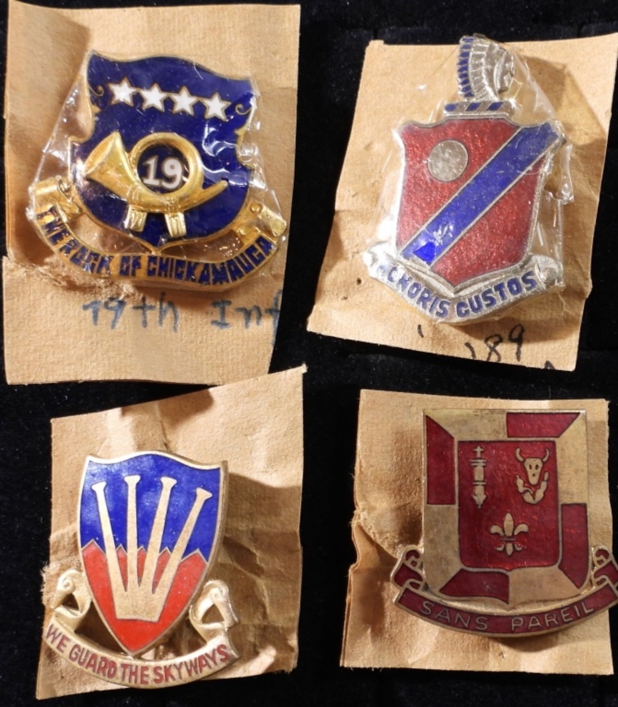 1) “We Guard The Skyways” 452nd Anti-Aircraft Artillery Battalion 2)”SANS PAREIL” is French for “Without Equal” U.S.Army’s 299th Engineer Battalion 3) 19th Infantry Regiment Distinctive 4) WWII US Army 189th Field