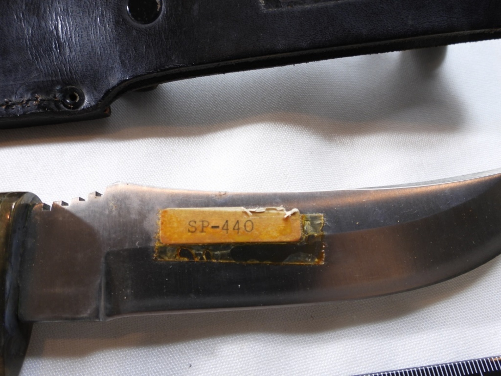 Used. This knife comes with a black leather sheath