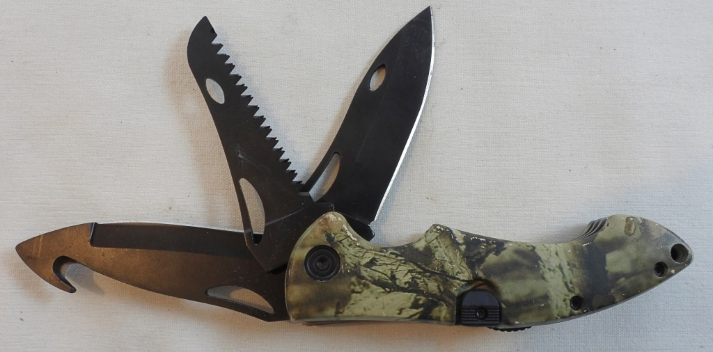 Mossy Oak 3 different types of blades, camo pattern, handle length is 4 1/2″