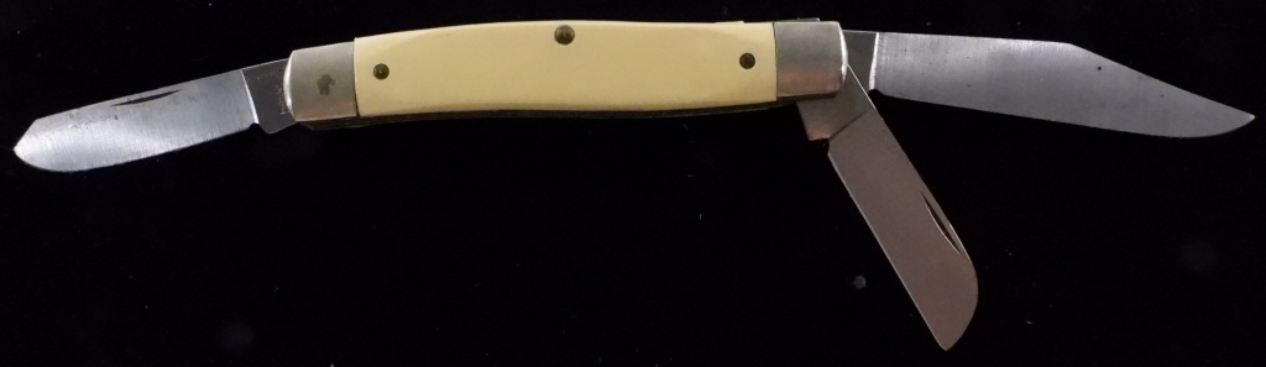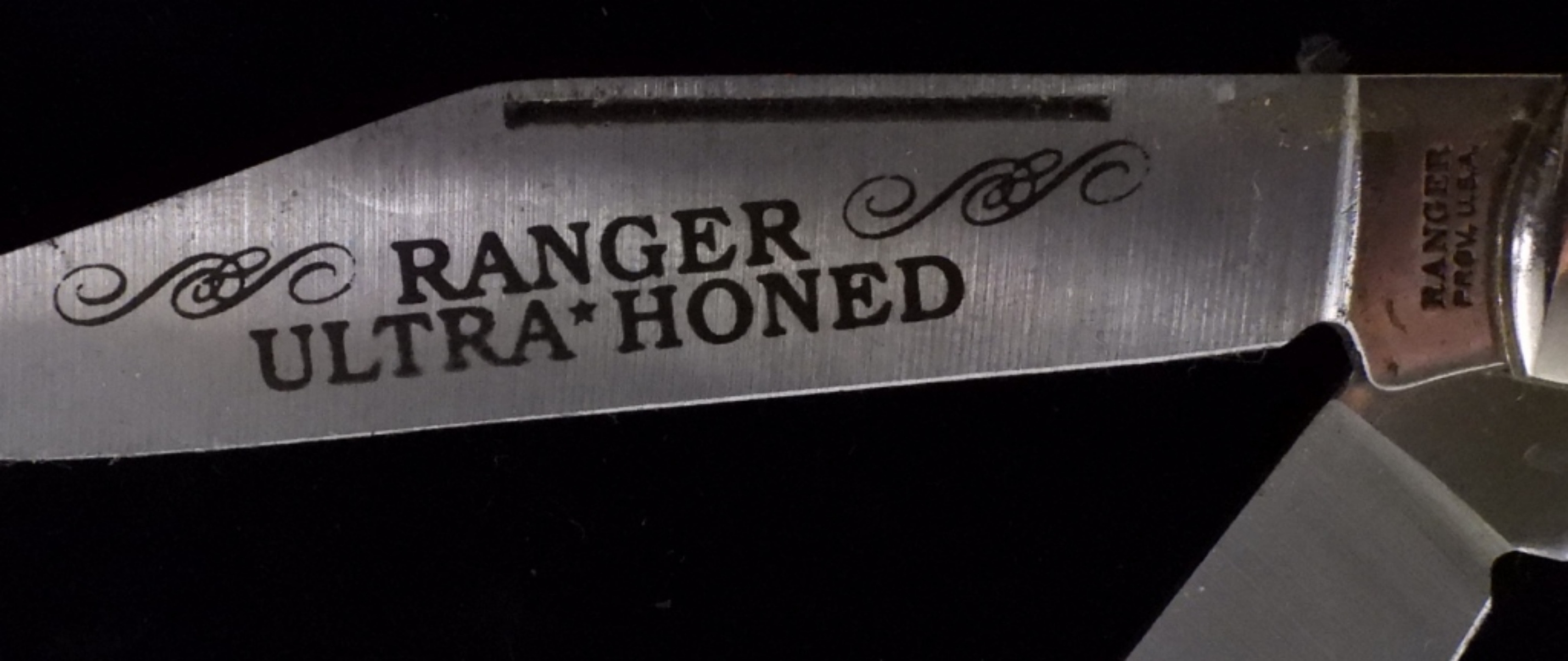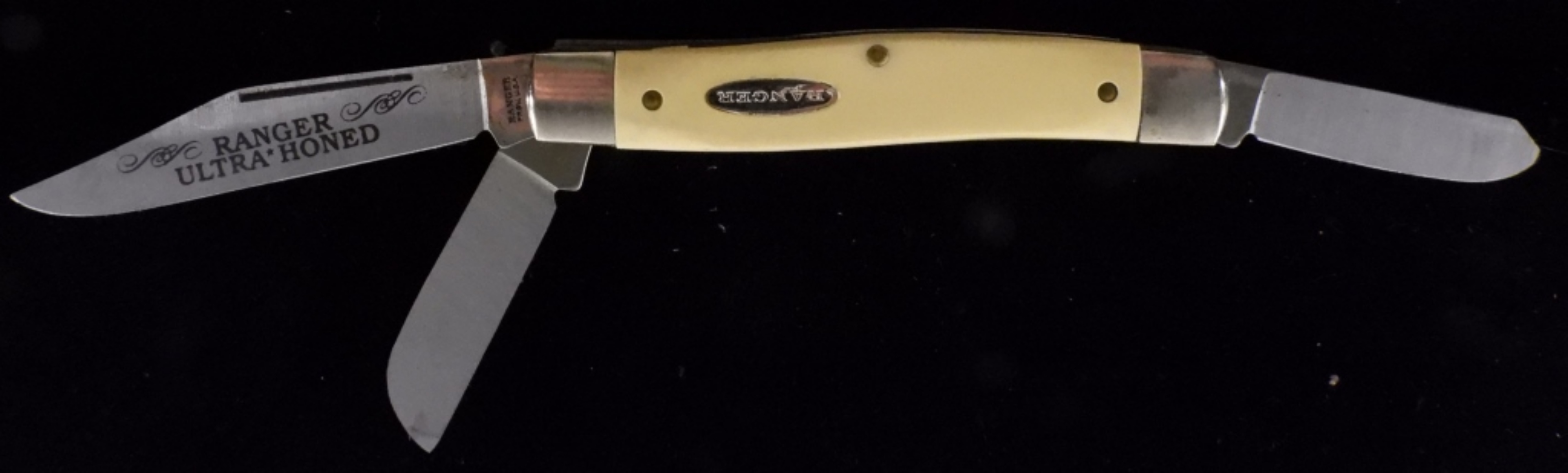 Ranger Ultra Honed pocket knife, 3 blades, and a handle measuring 4″