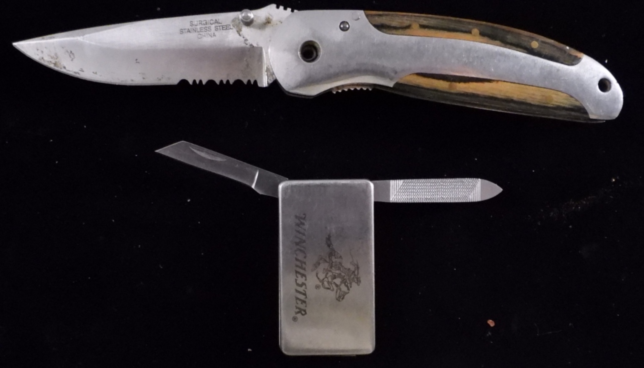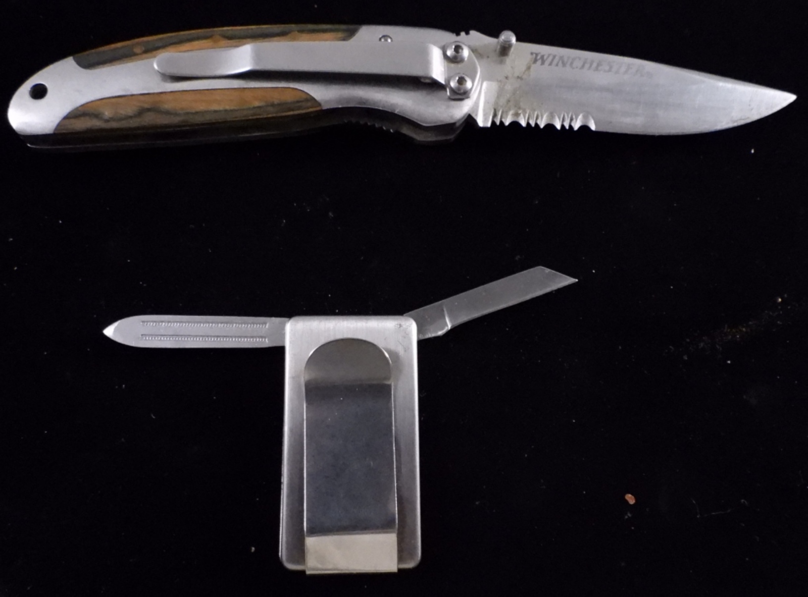 1) A folding pocket knife with a belt clip. 2) Is a small blade and a small file square belt clip knife