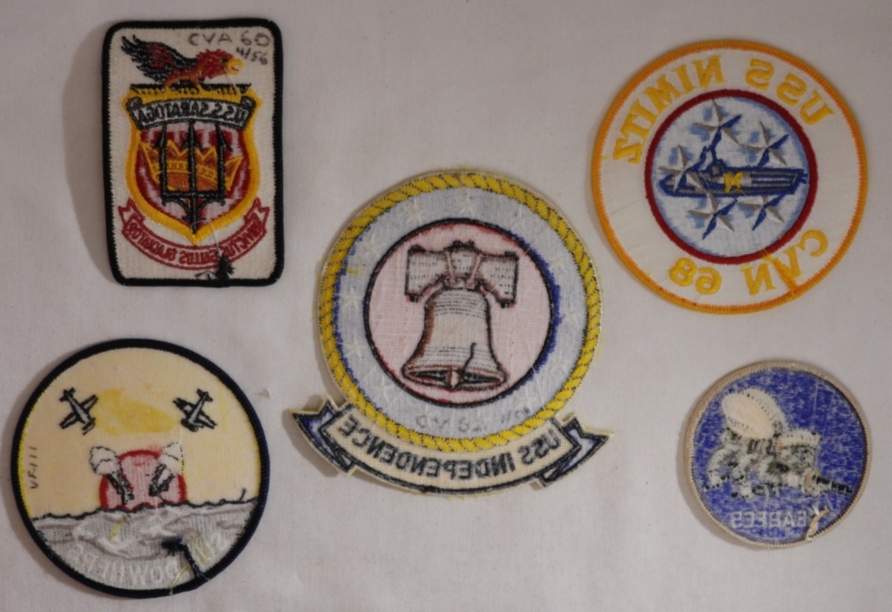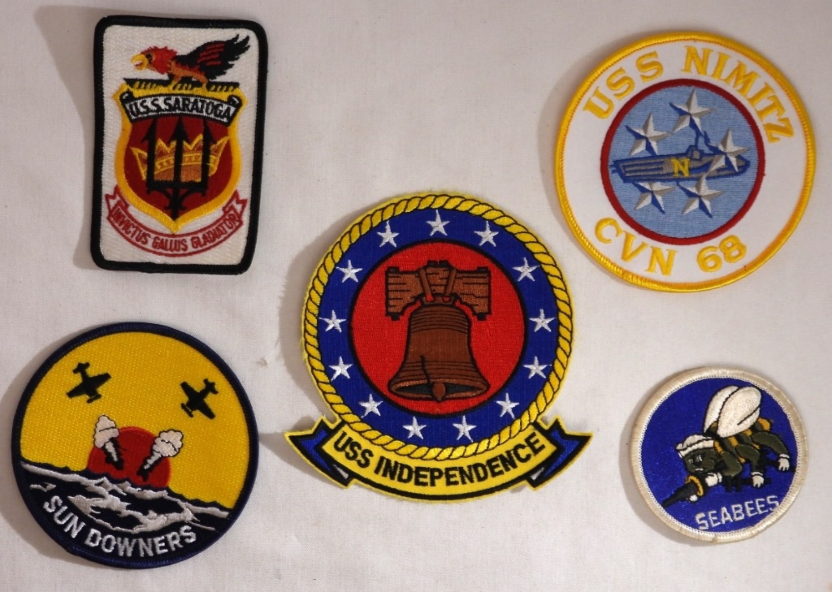 5 United States Navy Patches, some of which include a vintage US Navy Tomcat Fighter Squadron VF-111 Sundowners Patch, and more.