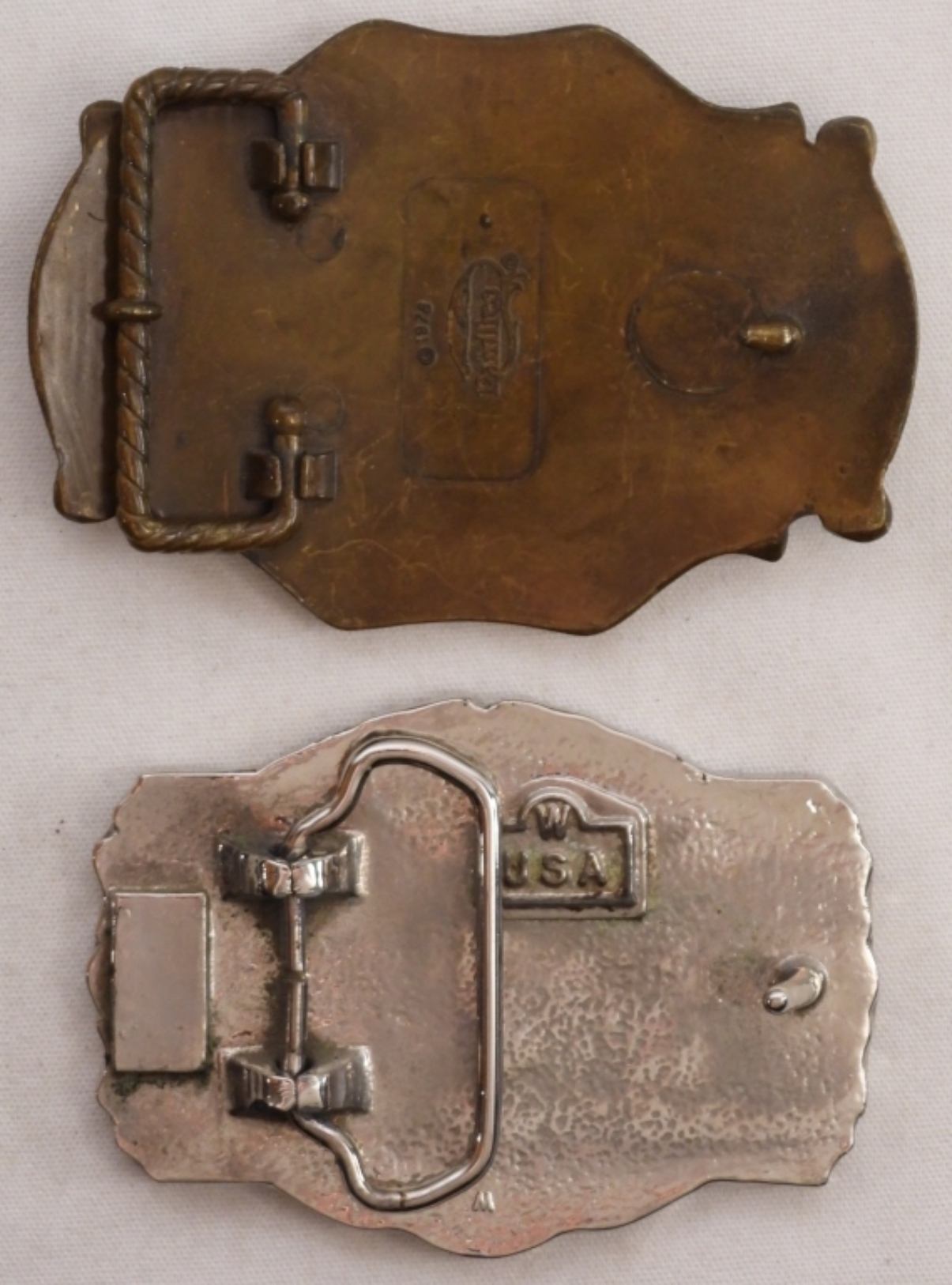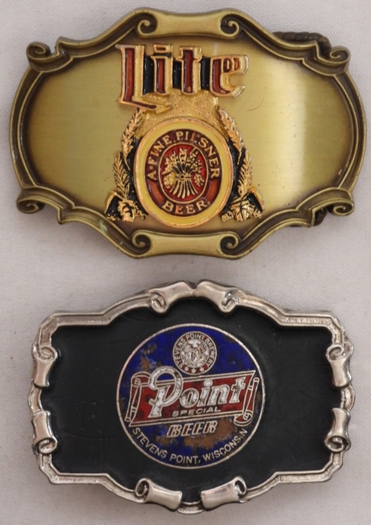 Vintage Miller Lite A Fine Pilsner Beer Promotional Belt Buckle and a Point Special beer Stevens Point belt buckle.
