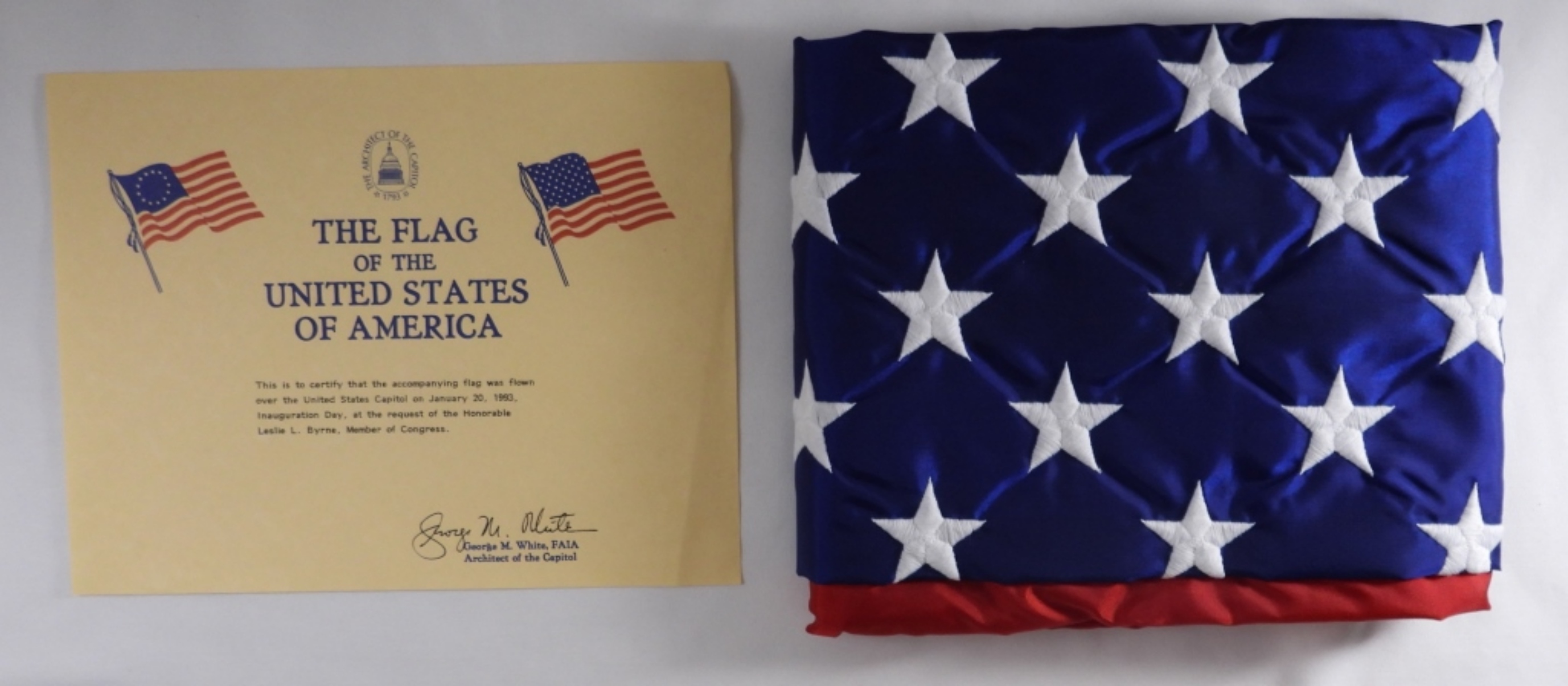Comes with a COA from The Architect Of The Capitol. This certifies that the accompanying flag was flown over the United States Capitol on January 20, 1993, on inauguration day. At the request of Leslie L. Byrne,