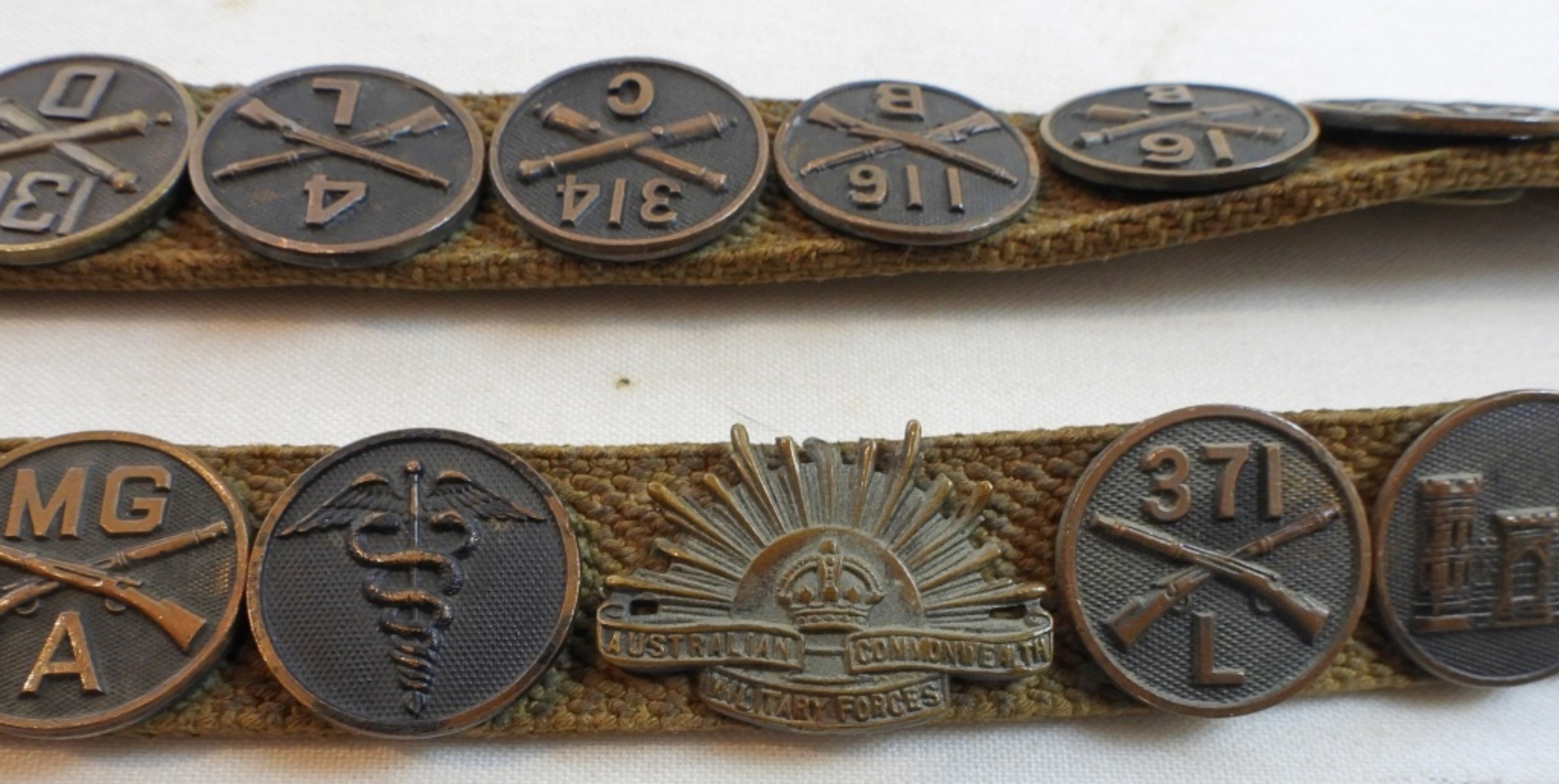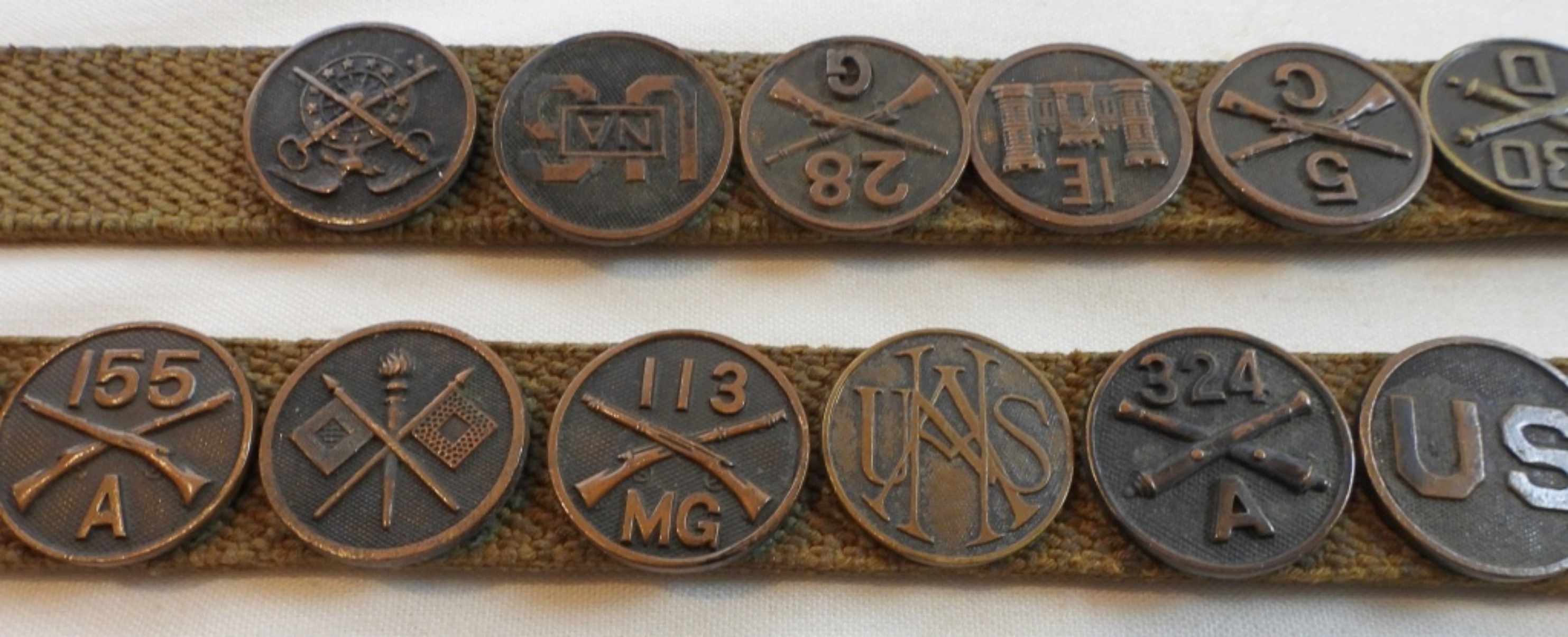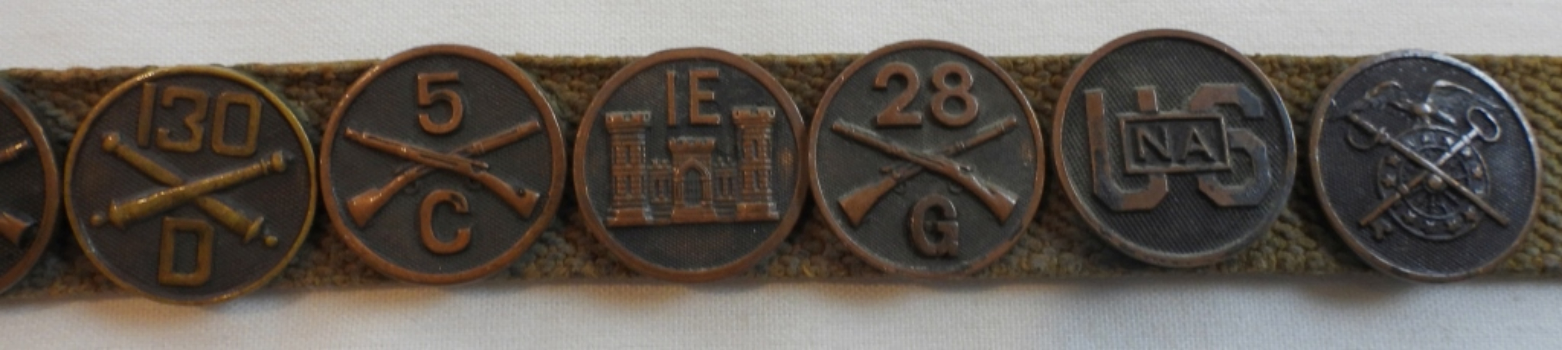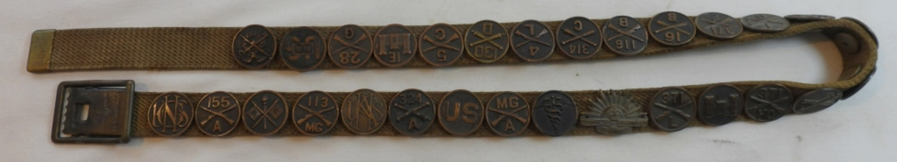 29 WWI U.S. collar discs and the Australian Rising Sun, all pinned to a belt, beautiful condition