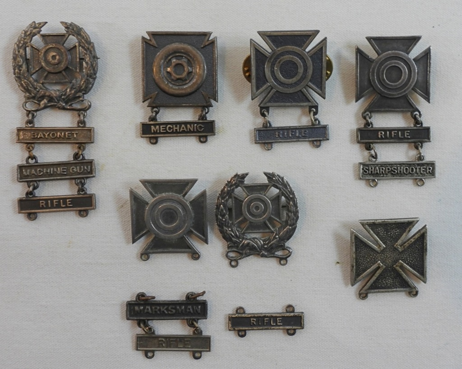 various badges, including, sharpshooters, bayonet, and others