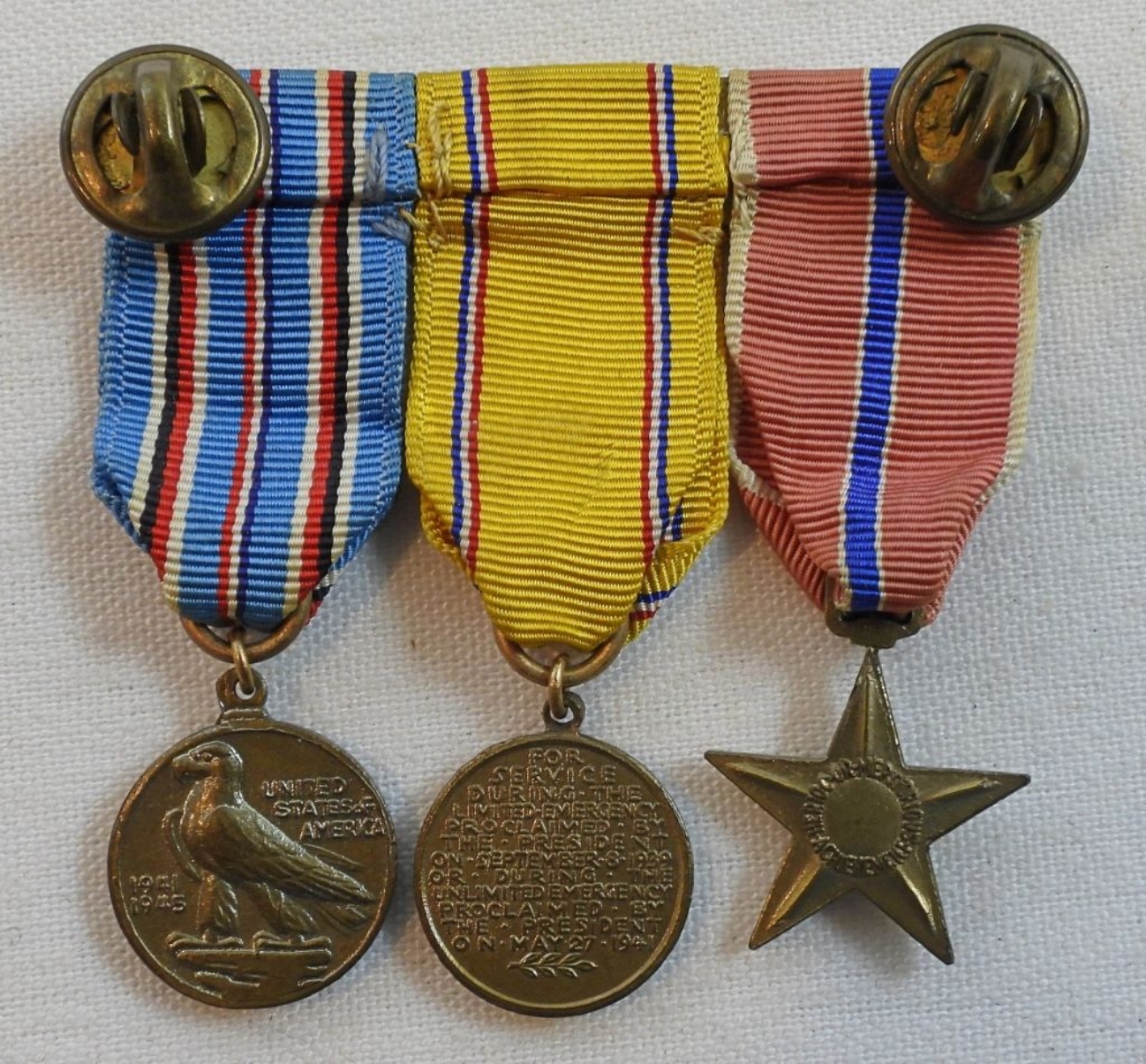 Bronze Star, American Defense, and Asiatic Pacific Campaign medals, all miniature and mounted