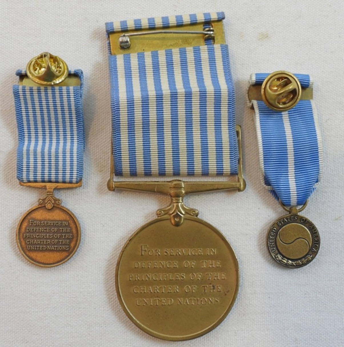 2 miniature medals, the Korean Service medal and the United Nations Defense medal for Korea, and a full-size United Nations Defense medal for Korea