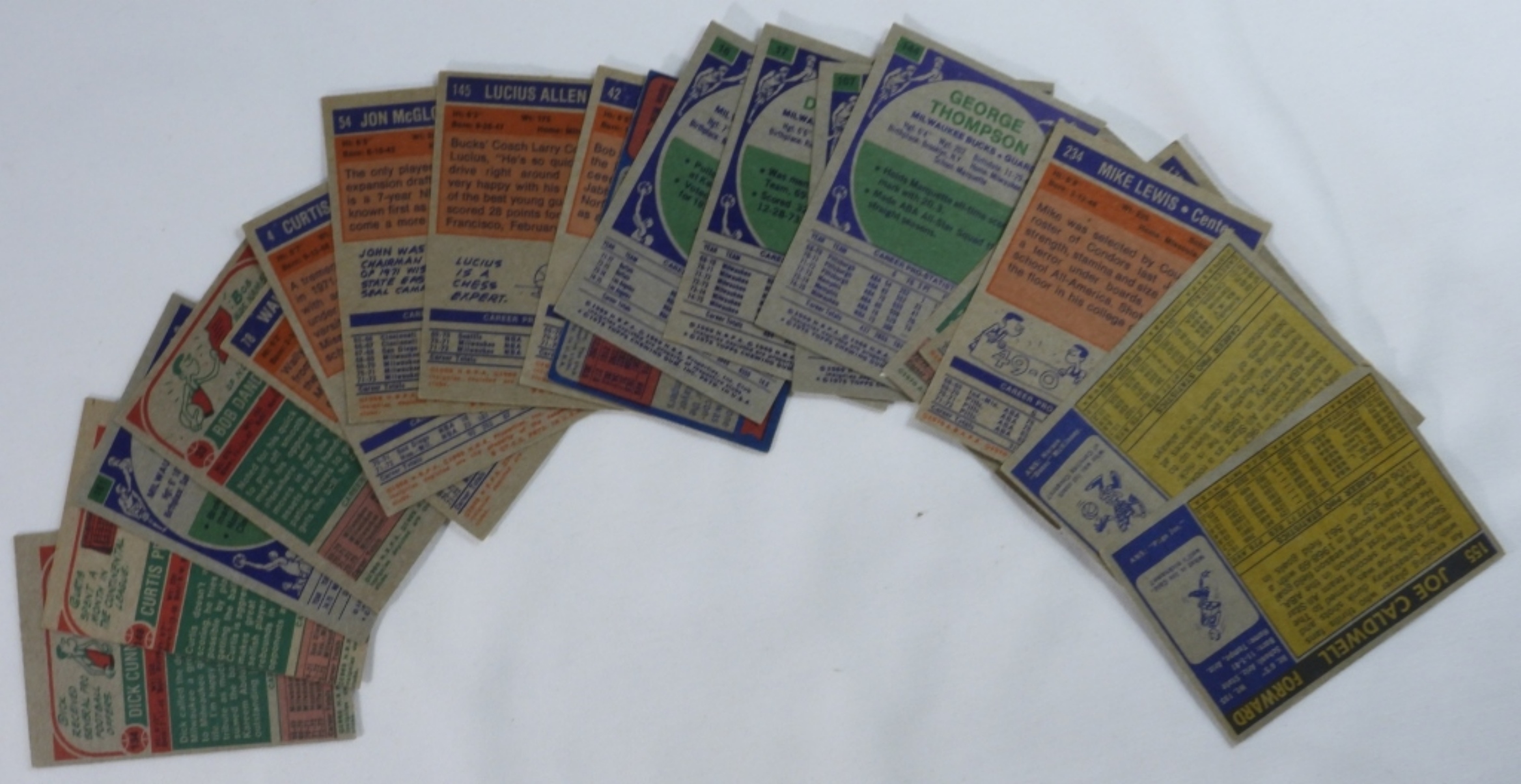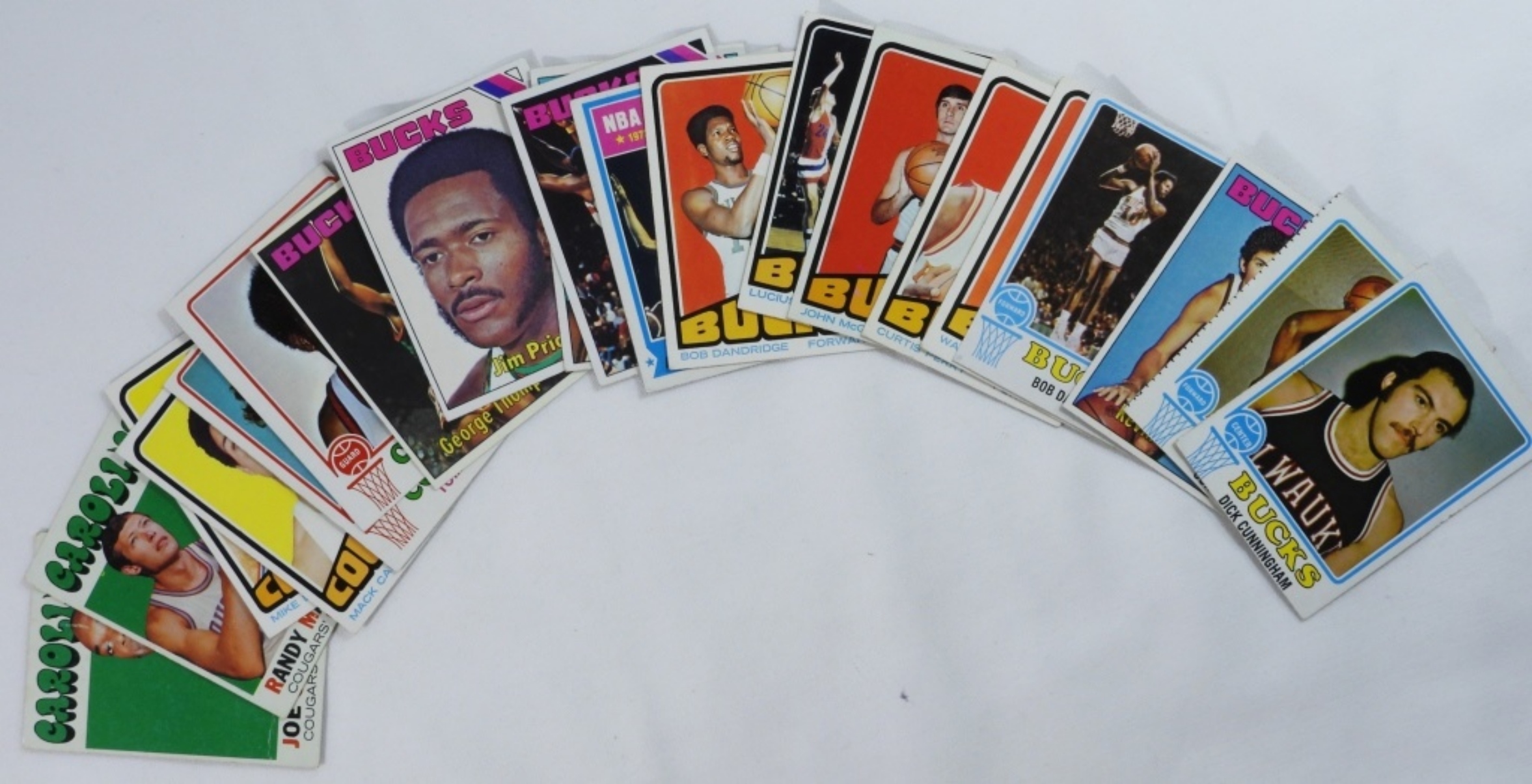 Mixed lot of 20 Bucks and Cougars basketball cards, some of which include Dick Cunningham #134, Steve Jones #179, and more.