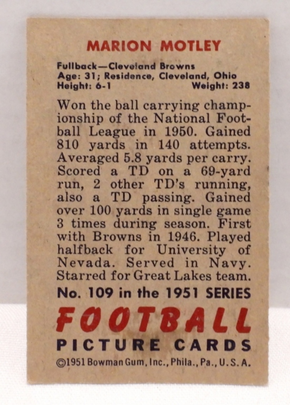 Marion Motley #109 in the 1951 series, good condition