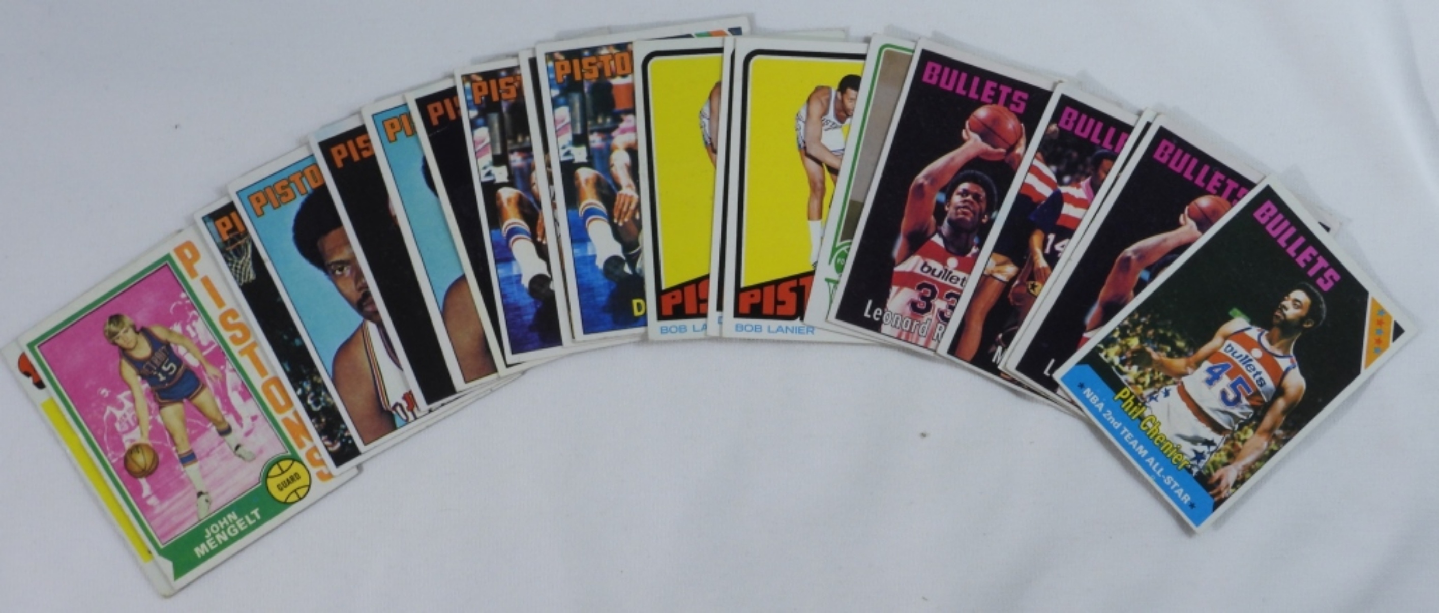 Mixed lot of 20 Bullets and Pistons basketball cards, some of which include Willie Norwood #39, Leonard Robinson #151, and more.