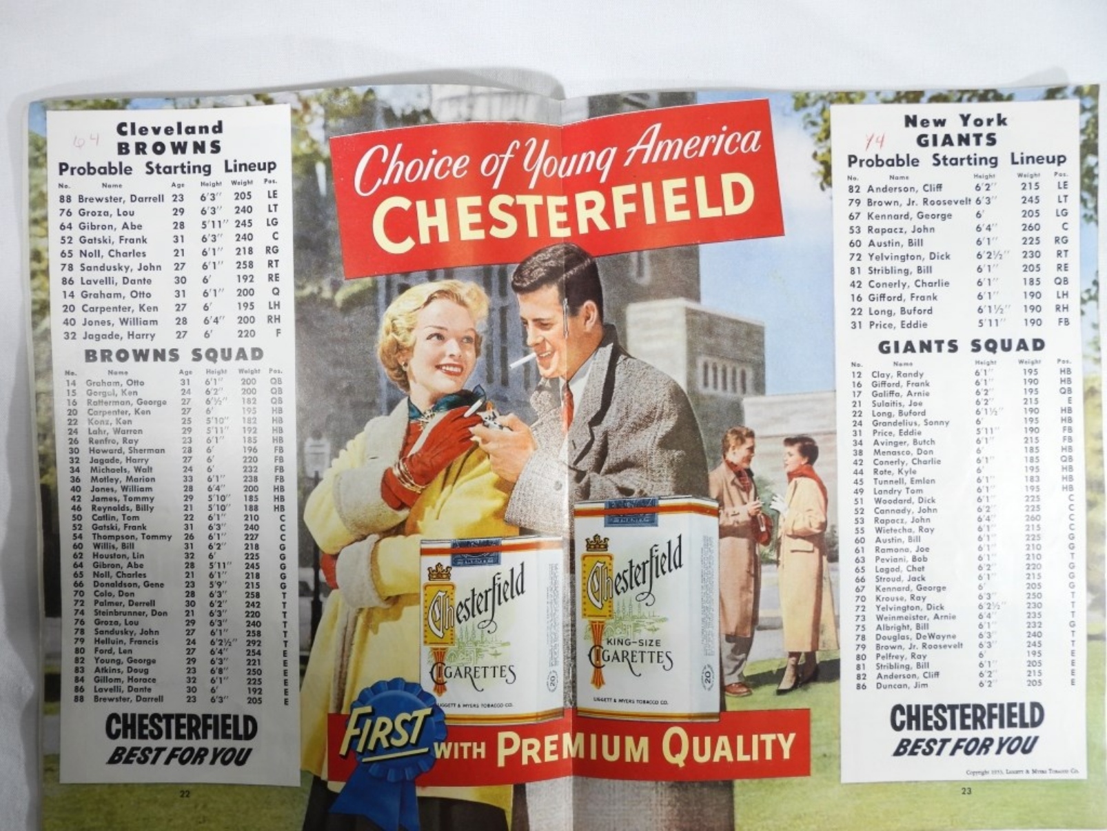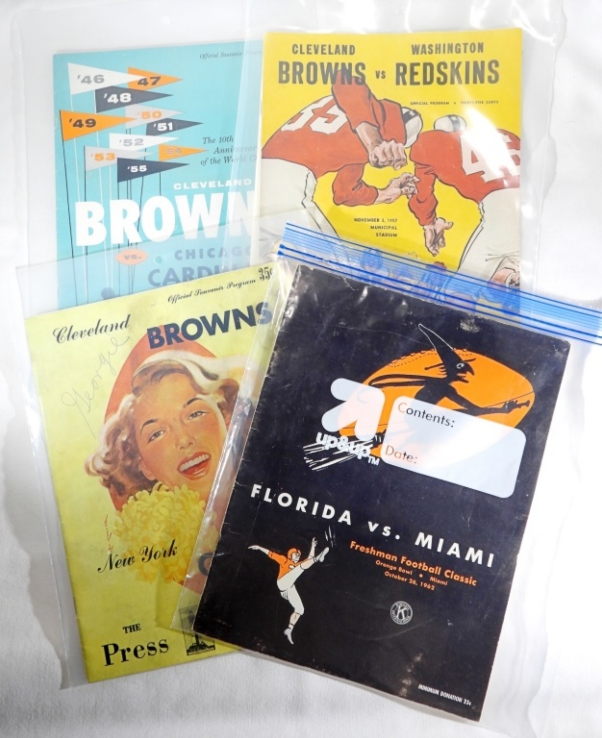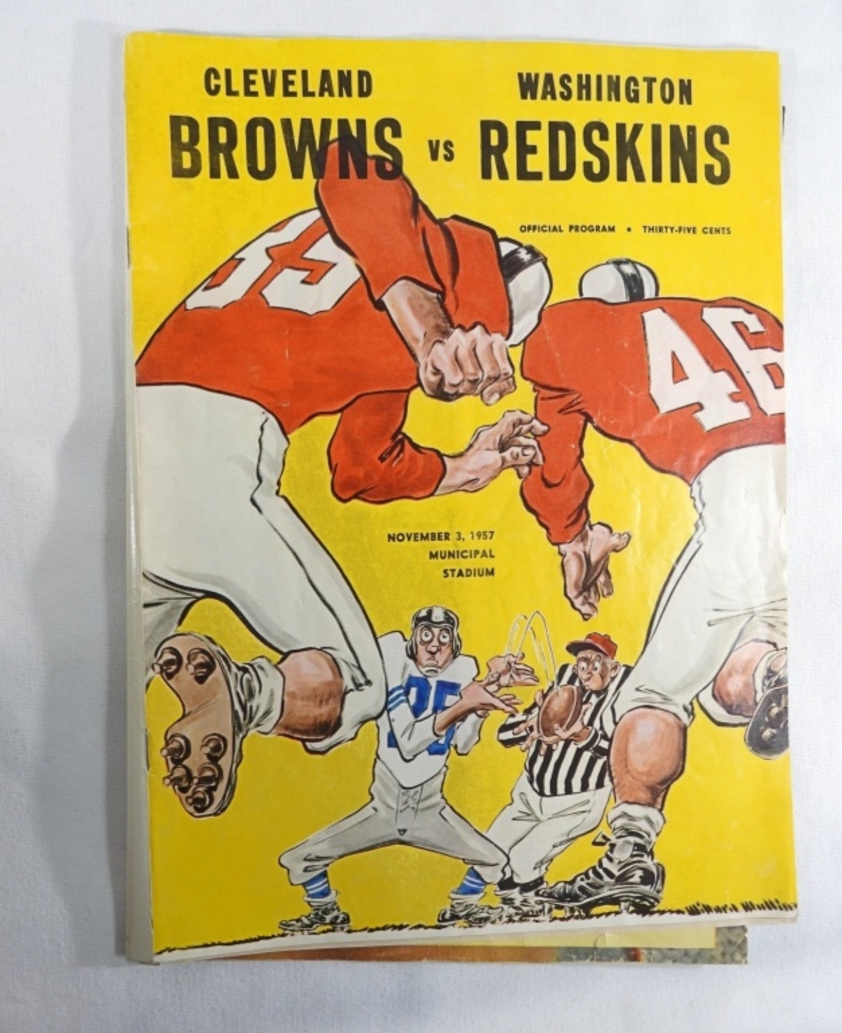 Cleveland Browns vs New York Giants, 1953, pencil writing on front, pages 22-23 have pen marks, center page is partially loose, Browns vs Redskins 1957, Jim Brown rookie year, center page is detached, spine is
